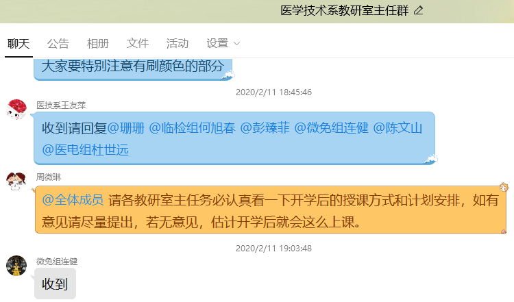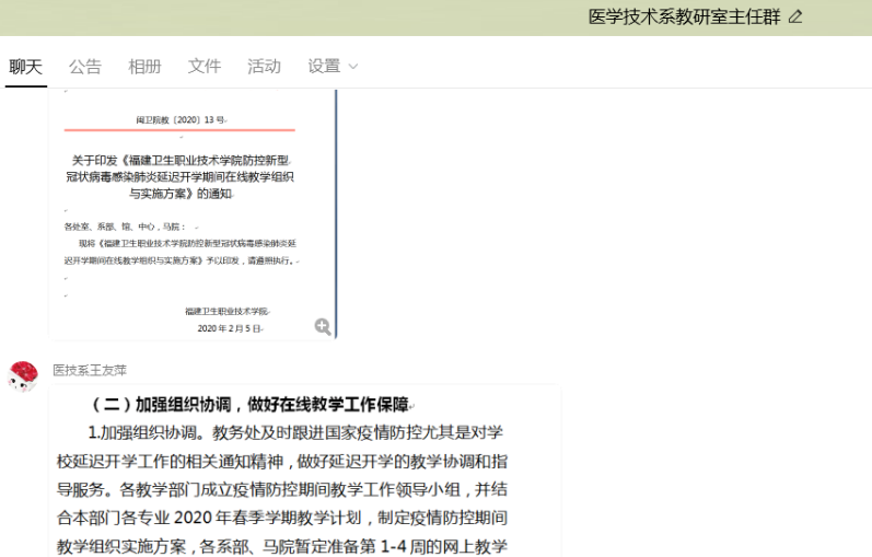 按照“推遲開(kāi)學(xué)不停學(xué)”的原則,各教研室主任積極開(kāi)展本學(xué)期教學(xué)工作安排,通過(guò)各教研室網(wǎng)絡(luò)群組織做好開(kāi)展在線教學(xué)和在線輔導(dǎo)的準(zhǔn)備工作