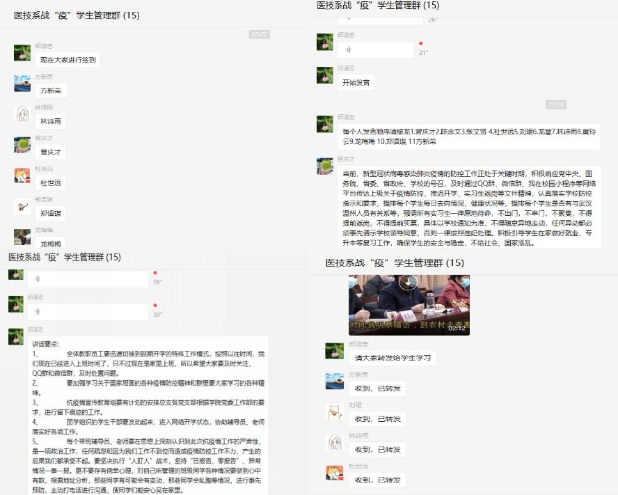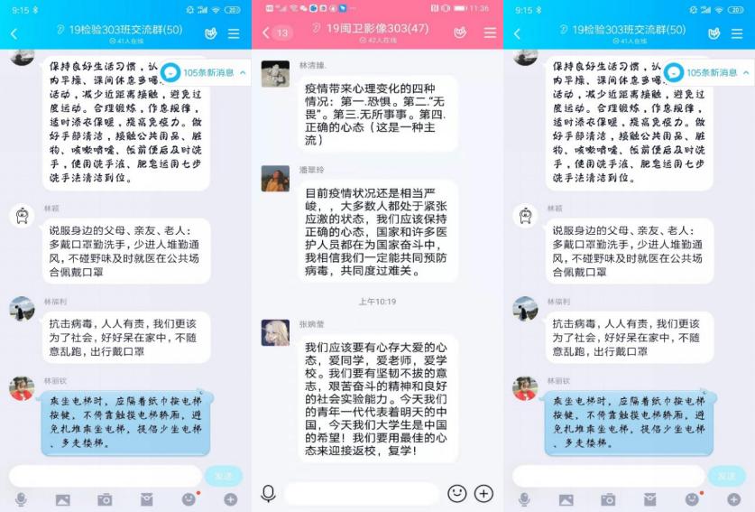 在新冠肺炎疫情防控的戰(zhàn)線上,輔導(dǎo)員們通過(guò)班群每日組織學(xué)生“云”打卡、排摸學(xué)生健康情況,盡職盡責(zé)地宣傳防控知識(shí),組織學(xué)習(xí)開(kāi)展心理健康學(xué)習(xí),用貼近學(xué)生的話語(yǔ)去傳播防疫的信念、溫暖、愛(ài)與力量。