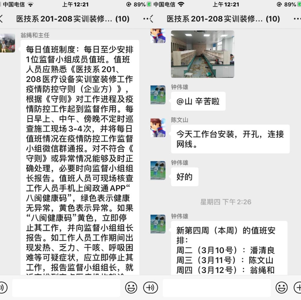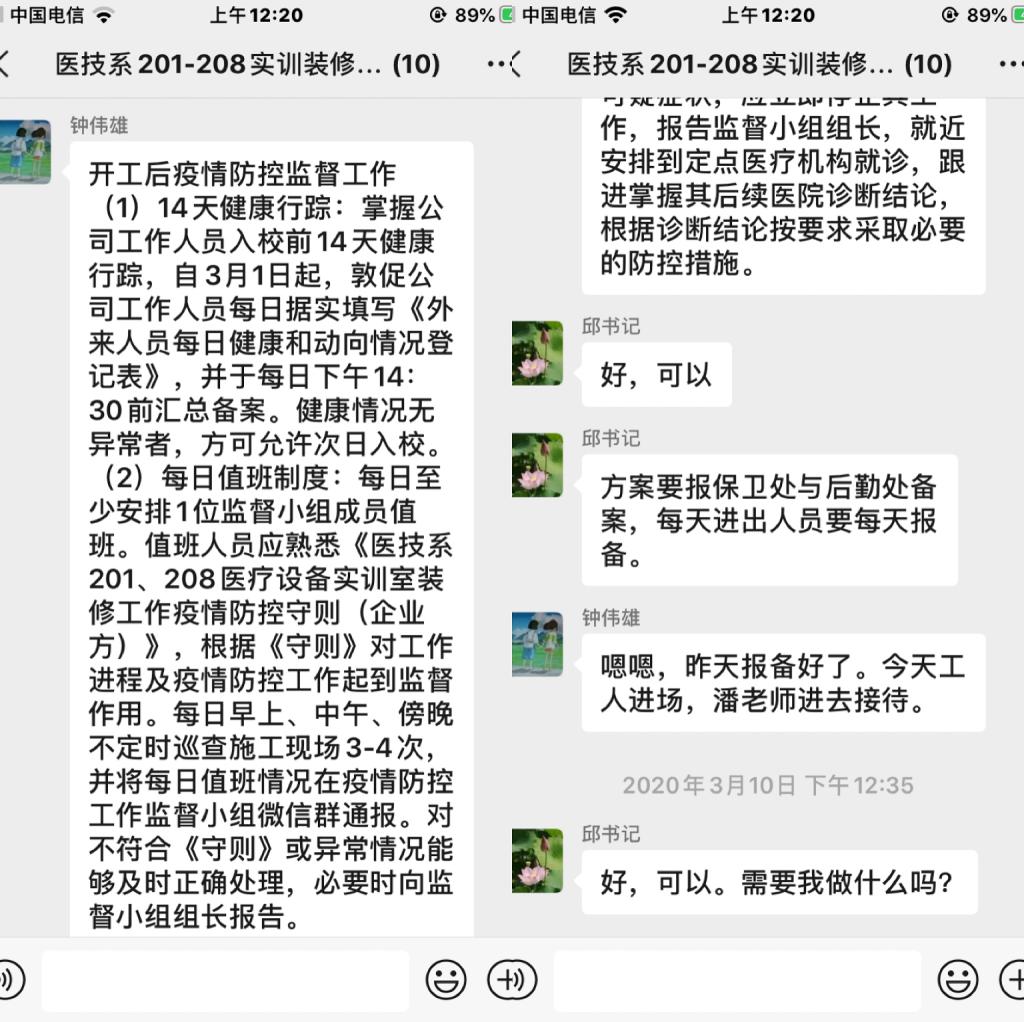 此外,醫(yī)技系今年重點工作內(nèi)容之一是創(chuàng)建融合共享型實訓室。醫(yī)技系邱書記和翁主任對此高度重視,與鐘偉雄等幾位項目負責人制定了詳細周密的實訓室裝修期間疫情防控細則,每日安排人員值班,疫情防控情況和裝修進度情況通過微信群實時信息化傳遞,以保證建設任務不受疫情影響,保障后期實踐教學任務順利進行。
