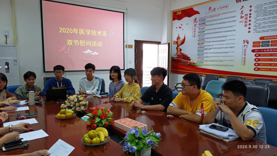 金秋九月,同慶佳節(jié)。9月30日中午,在中秋、國慶雙節(jié)來臨之際,學(xué)院黨委委員、副院長、關(guān)工委常務(wù)副主任黃銘珊來到醫(yī)學(xué)技術(shù)系會(huì)議室與醫(yī)學(xué)技術(shù)系師生一同召開“慶中秋 迎國慶”在校學(xué)生座談會(huì),讓遠(yuǎn)離家鄉(xiāng)的學(xué)子在節(jié)日里感受到學(xué)校的關(guān)懷與溫暖。黃銘珊代表學(xué)院向假期在校的學(xué)生致以節(jié)日的問候。系主任翁繩和、系黨總支書記陳俊穎、系副主任魏碧娜、輔導(dǎo)員劉珺、龍梅梅和13名學(xué)生代表參加了座談會(huì)。座談會(huì)由陳俊穎主持。
