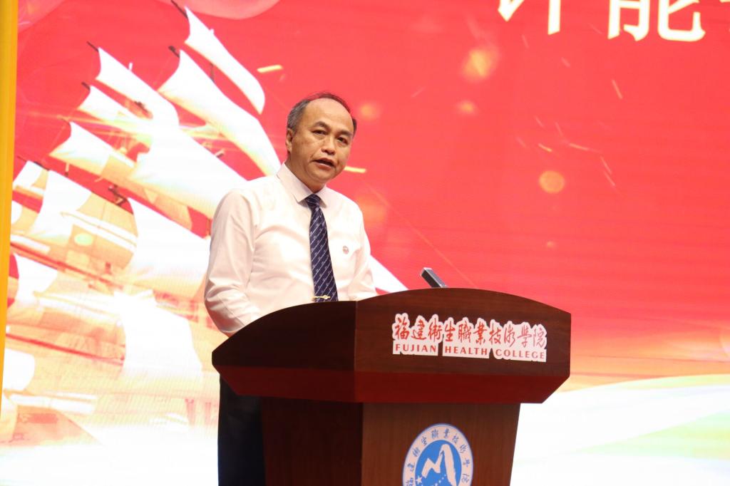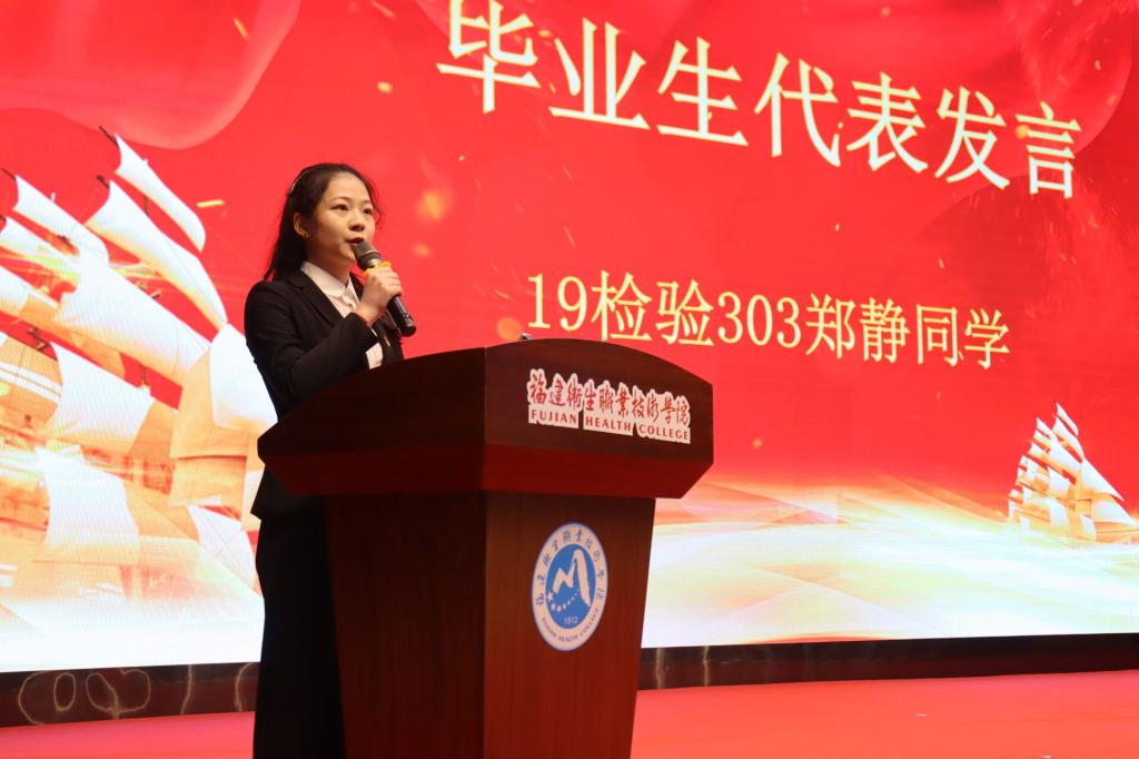 19檢驗303班鄭靜同學(xué)作為畢業(yè)生代表發(fā)言,她深情回憶了在閩衛(wèi)院的美好時光,抒發(fā)了對母校和恩師的感恩和不舍,表達(dá)了醫(yī)技學(xué)子奔赴一線基層,以實干奮斗服務(wù)健康中國的豪情壯志。