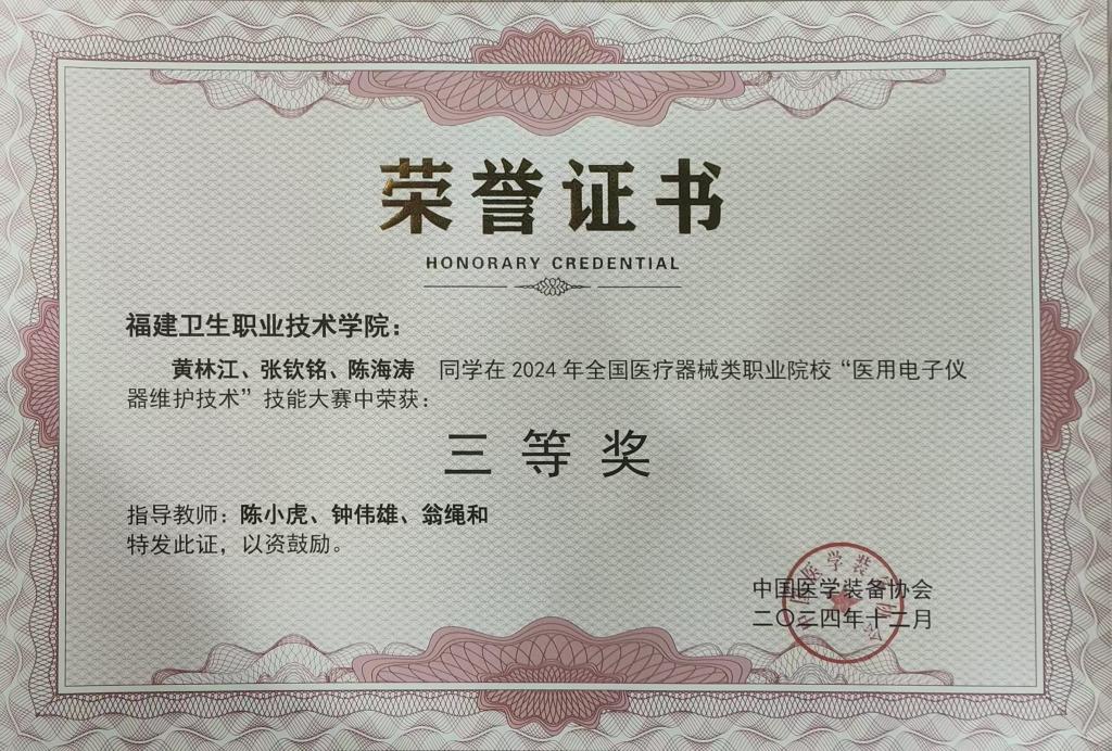 12月6日至9日,2024年全國醫(yī)療器械類職業(yè)院?!搬t(yī)用電子儀器維護(hù)技術(shù)”技能大賽在廣東食品藥品職業(yè)學(xué)院舉行。本次大賽共有來自全國各地30所醫(yī)療器械相關(guān)職業(yè)院校參賽,經(jīng)過兩天的激烈角逐,我院醫(yī)用電子儀器技術(shù)專業(yè)學(xué)生黃林江、張欽銘和智能醫(yī)療裝備技術(shù)專業(yè)學(xué)生陳海濤在競賽中發(fā)揮出色,榮獲團(tuán)體三等獎(jiǎng)。