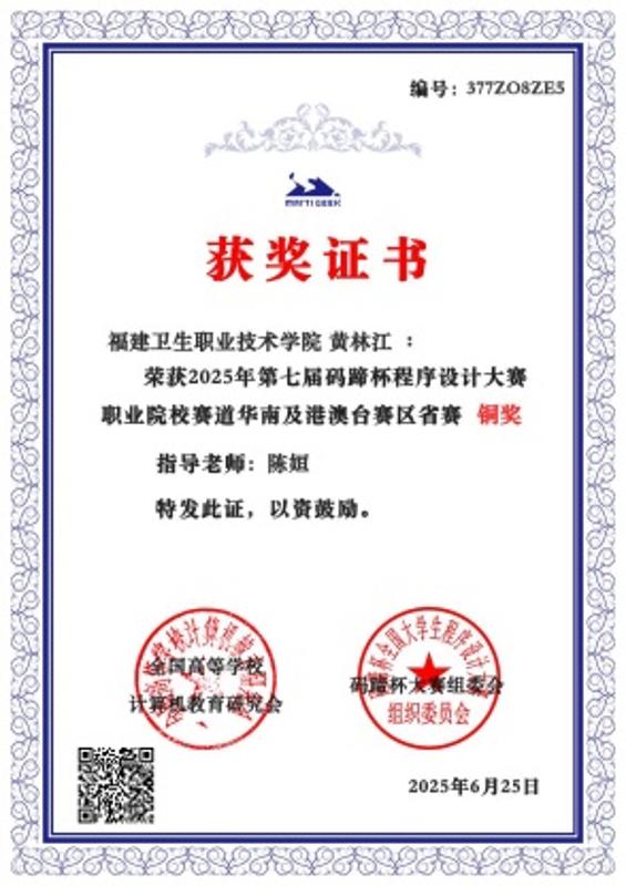 我校3名學(xué)生,在醫(yī)學(xué)技術(shù)與工程學(xué)院陳姮教師的指導(dǎo)下,在職業(yè)院校賽道斬獲省賽(華南及港澳臺(tái)賽區(qū))金獎(jiǎng) 1項(xiàng)(陳詩(shī)晴)、銅獎(jiǎng)1項(xiàng)(黃林江)。并勇奪國(guó)賽銅獎(jiǎng)1項(xiàng)(陳詩(shī)晴)、優(yōu)秀獎(jiǎng)1項(xiàng)(黃林江)。我校再創(chuàng)佳績(jī),充分彰顯了學(xué)校“以賽促教、以賽促學(xué)”的人才培養(yǎng)理念。