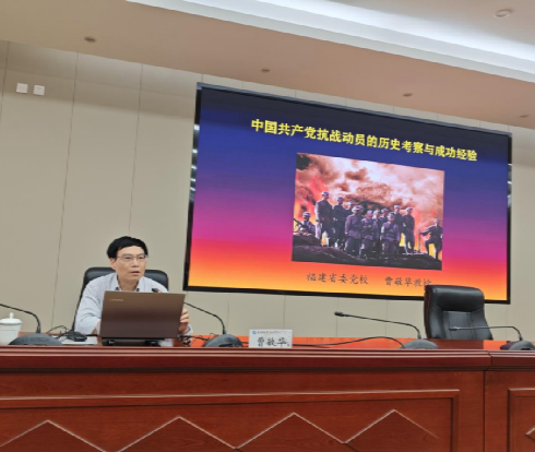 隨后,曹教授圍繞“中國共產(chǎn)黨抗戰(zhàn)動員思想的形成和發(fā)展”,清晰梳理其從萌芽到成熟的演進脈絡(luò),使師生對這一思想體系的發(fā)展歷程與核心要義形成系統(tǒng)性認(rèn)知。