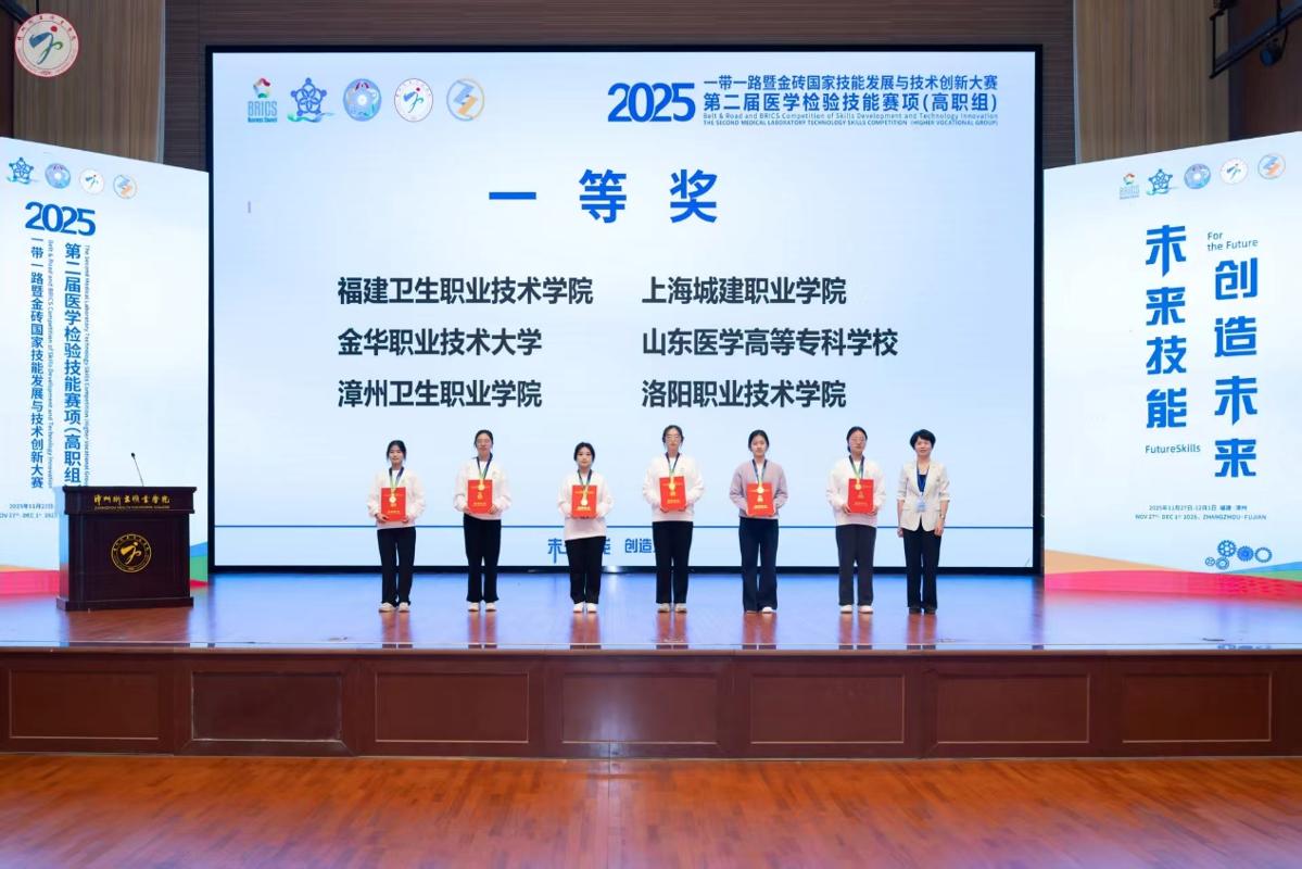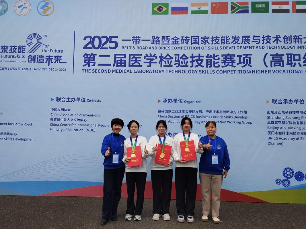 11月27日—30日, 2025“一帶一路”暨金磚國家技術(shù)發(fā)展與創(chuàng)新大賽第二屆醫(yī)學(xué)檢驗(yàn)技能競(jìng)賽(高職組)在漳州衛(wèi)生職業(yè)學(xué)院舉行,來自全國各地的60支隊(duì)伍同臺(tái)競(jìng)技。經(jīng)過激烈的角逐和比拼,我校23級(jí)檢驗(yàn)302班危恬慧、23級(jí)檢驗(yàn)303班張麗珍、23級(jí)檢驗(yàn)304班張欣熒等三位學(xué)生憑借扎實(shí)的專業(yè)基礎(chǔ)和出色的現(xiàn)場(chǎng)表現(xiàn),勇奪桂冠,取得團(tuán)體第一名的優(yōu)異成績,獲得優(yōu)先出國比賽的機(jī)會(huì)。學(xué)校榮獲“最佳組織獎(jiǎng)”,指導(dǎo)老師林雪金、吳靜榮獲“優(yōu)秀指導(dǎo)教師”榮譽(yù)稱號(hào)。充分展示了我校醫(yī)學(xué)檢驗(yàn)技術(shù)人才的培養(yǎng)質(zhì)量與教學(xué)實(shí)力!