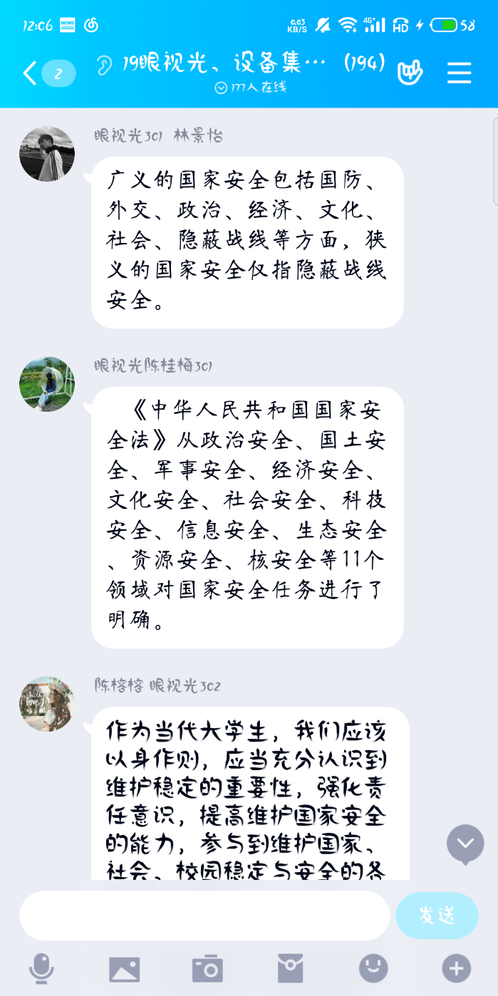 在團日活動中,同學(xué)們學(xué)習(xí)了“國家安全教育日”相關(guān)文章,觀看了“國家安全教育日”相關(guān)視頻。通過學(xué)習(xí),同學(xué)們明白了,國家安全,人人有責(zé);知道了,公民和組織發(fā)現(xiàn)危害國家的行為應(yīng)及時撥打12339舉報電話;記住了,當(dāng)發(fā)現(xiàn)國家秘密已經(jīng)泄露或者可能泄露時,應(yīng)當(dāng)立即采取補救措施,并在24小時內(nèi)向同級保密行政管理部門和上級主管部門報告。