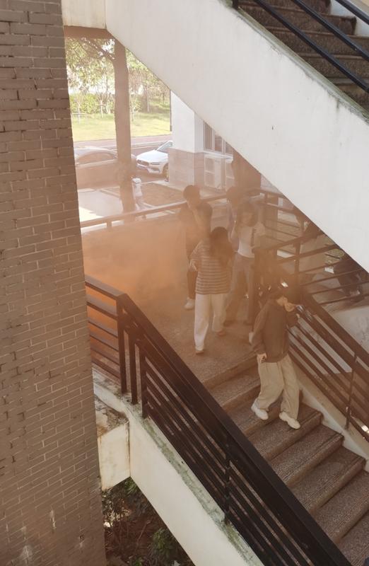第二部分應(yīng)急逃生演練(消防、地震)。演練開啟前安全工作處林澤文老師先詳細(xì)介紹消防器材的使用、演練程序、疏散信號、疏散路線、疏散順序等注意事項,并強(qiáng)調(diào)在疏散過程中切勿擁擠、推搡導(dǎo)致踩踏事件發(fā)生。演練工作組接到演練指令后,燃放煙霧,平靜的院部樓館突然黃煙四起、警報鈴響,負(fù)責(zé)老師迅速到達(dá)指定崗位,學(xué)生們也隨之做出反應(yīng),在現(xiàn)場人員的指揮下,學(xué)生們紛紛用手、濕紙巾等捂住口鼻,彎著腰從預(yù)定的逃生路線進(jìn)行撤離,撤退中所有同學(xué)緊靠右行,撤退過程井然有序,參加本次演練師生全部安全撤離到指定區(qū)域。