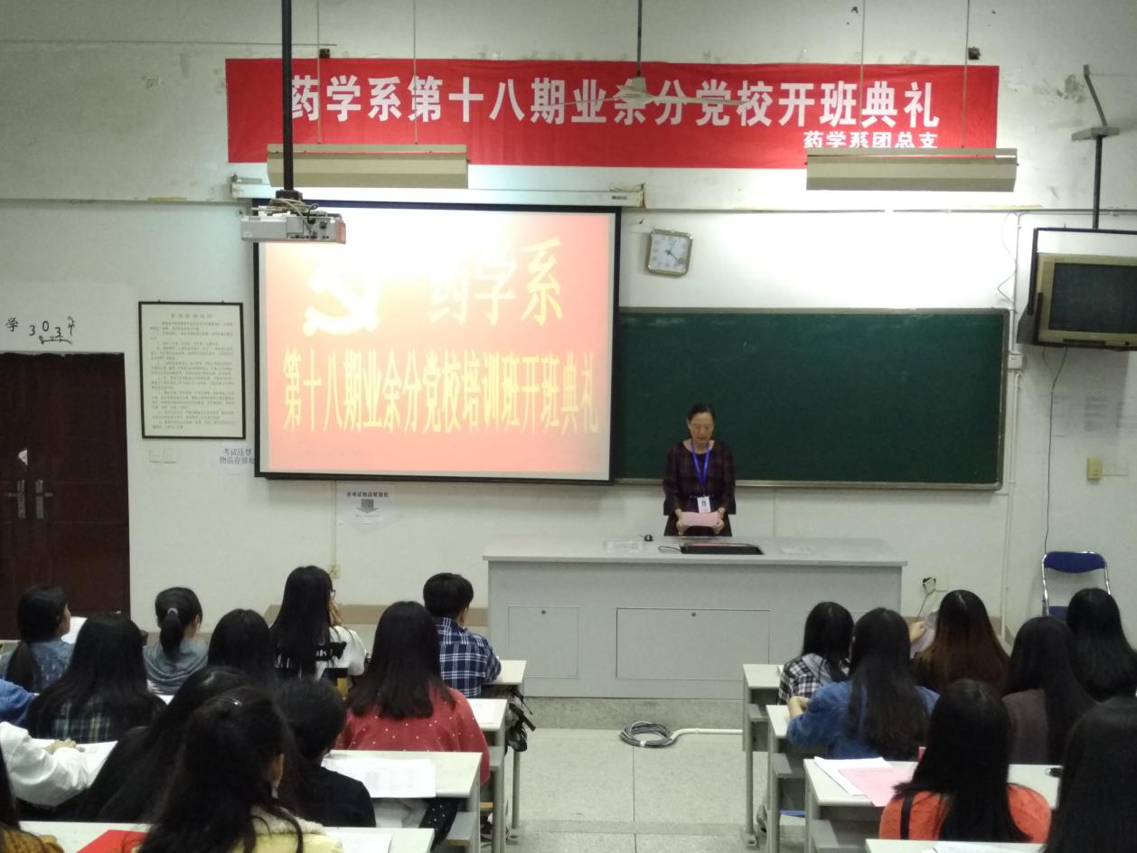 2016年11月8日,藥學(xué)系第十八期業(yè)余分黨校開班典禮在藥二階隆重舉行,蒞臨本次大會的系領(lǐng)導(dǎo)老師有:藥學(xué)系黨總支蘇愛華書記、林燕副書記、藥學(xué)系第一黨支部書記葉雅沁老師、藥學(xué)系第二黨支部書記何舒瀾老師、學(xué)生黨支部書記陳瑜老師以及藥學(xué)系團(tuán)總支書記李寶珠老師和團(tuán)副書記黃嵩梅老師。