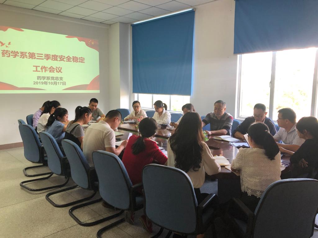 2019年10月17日,藥學(xué)系黨總支在系部會議室召開第三季度安全穩(wěn)定工作會議。藥學(xué)系黨總支書記鄭力宏、副主任(主持工作)肖健、黨總支副書記賴文金、副主任潘雪豐、總支委員、各支部書記、教研室主任、實訓(xùn)中心主任及全體輔導(dǎo)員到場參會,會議由黨總支書記鄭力宏主持。