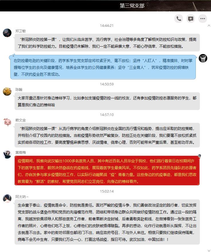 2月24日下午,就當日上午開講的復(fù)旦大學(xué)“新冠肺炎防控第一課”,藥學(xué)系學(xué)生黨支部組織全體師生黨員,通過QQ線上學(xué)習形式,集體學(xué)習防控重點、交流學(xué)習心得。