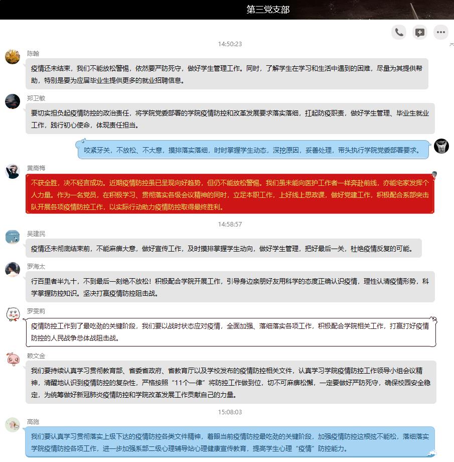 學(xué)習(xí)過程中,在習(xí)近平總書記3月4日中共中央政治局常務(wù)委員會會議上的重要講話、省委常委會(擴(kuò)大)會議暨應(yīng)對新冠肺炎疫情工作領(lǐng)導(dǎo)小組第十八次會議等精神指引下,支部陳翰書記詳細(xì)闡讀了我院院領(lǐng)導(dǎo)在學(xué)院疫情防控工作領(lǐng)導(dǎo)小組第六次會議暨黨委中心組學(xué)習(xí)擴(kuò)大會議上的重要指示,尤其強(qiáng)調(diào)針對學(xué)生工作實(shí)際,如何在信息應(yīng)用、渠道暢通、依法治校等三個(gè)方面切實(shí)踐行服務(wù)學(xué)生初心及如何關(guān)注并做好就業(yè)、招生、特殊群體服務(wù)等方面的學(xué)院部署。陳翰書記借用學(xué)院黨委曾武祈書記的講話,強(qiáng)調(diào)所有學(xué)生工作者及先進(jìn)學(xué)生代表一定要增強(qiáng)必勝之心、責(zé)任之心、仁愛之心、謹(jǐn)慎之心“四心”,做好宣傳教育、做優(yōu)抗疫氛圍,提高政治站位,確保疫情期間各項(xiàng)學(xué)生工作落地見效。