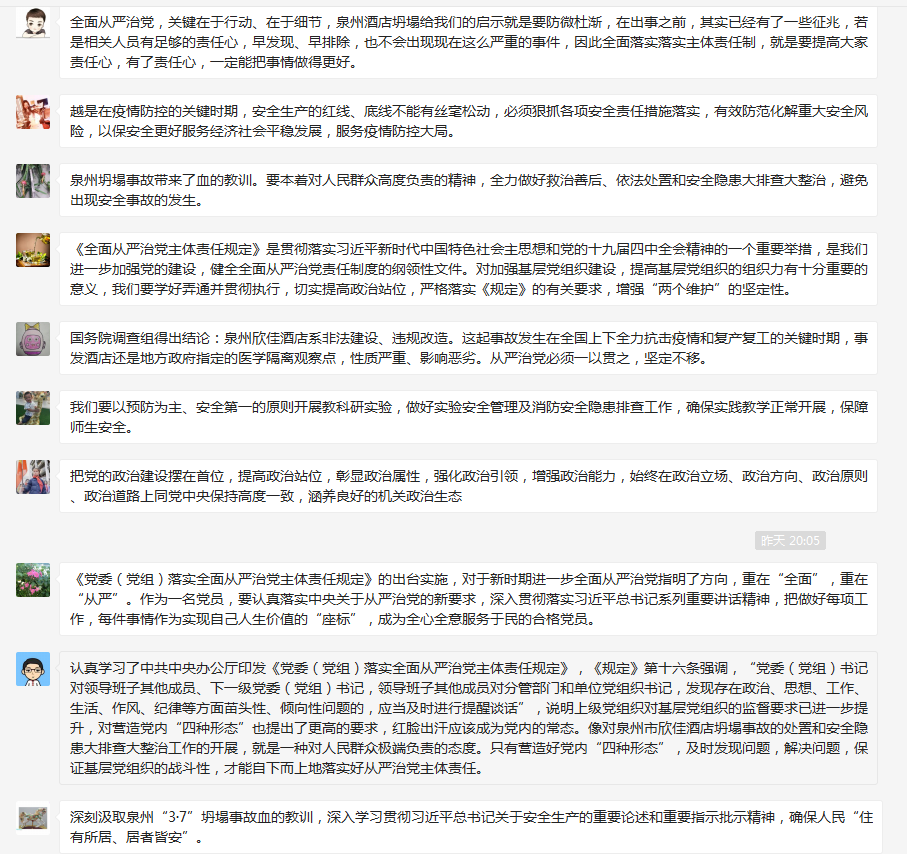 與會同志結(jié)合個(gè)人崗位實(shí)際交流心得,大家紛紛表示將深刻汲取泉州“3·7”坍塌事故血的教訓(xùn),以案示警中受警醒、明法紀(jì),不僅如此,深入學(xué)習(xí)貫徹習(xí)近平總書記關(guān)于全面從嚴(yán)治黨重要論述,立足崗位,嚴(yán)格落實(shí)、積極為院系做貢獻(xiàn)。
