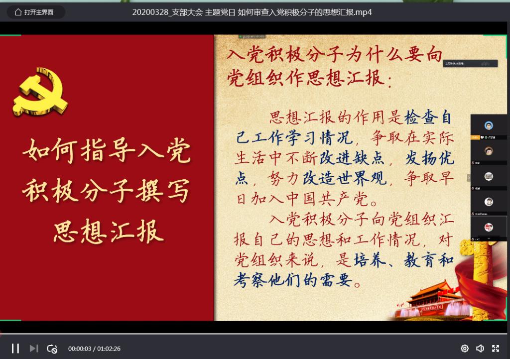3月29日,藥學(xué)系第一黨支部以《如何指導(dǎo)入黨積極分子撰寫思想?yún)R報(bào)》為題,在騰訊會議APP開展線上主題黨日活動。