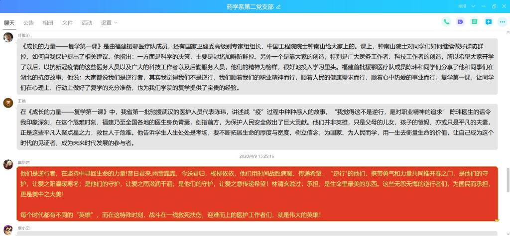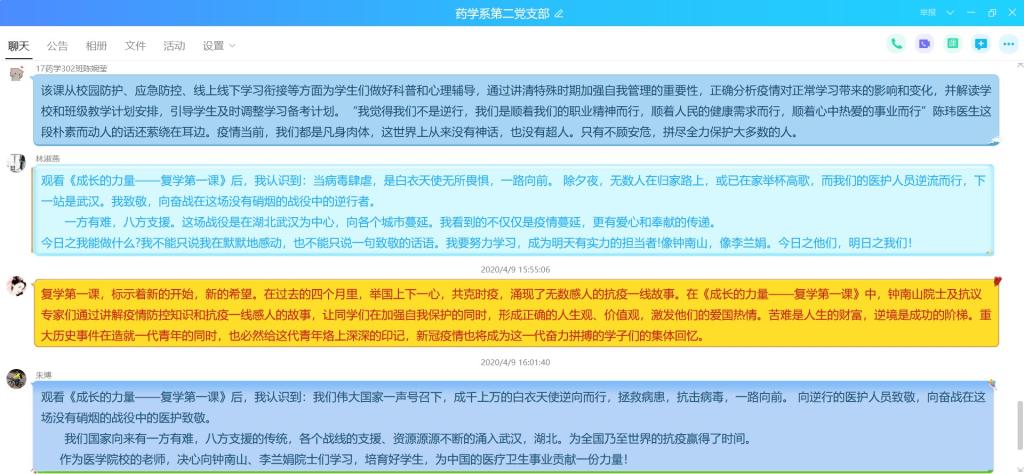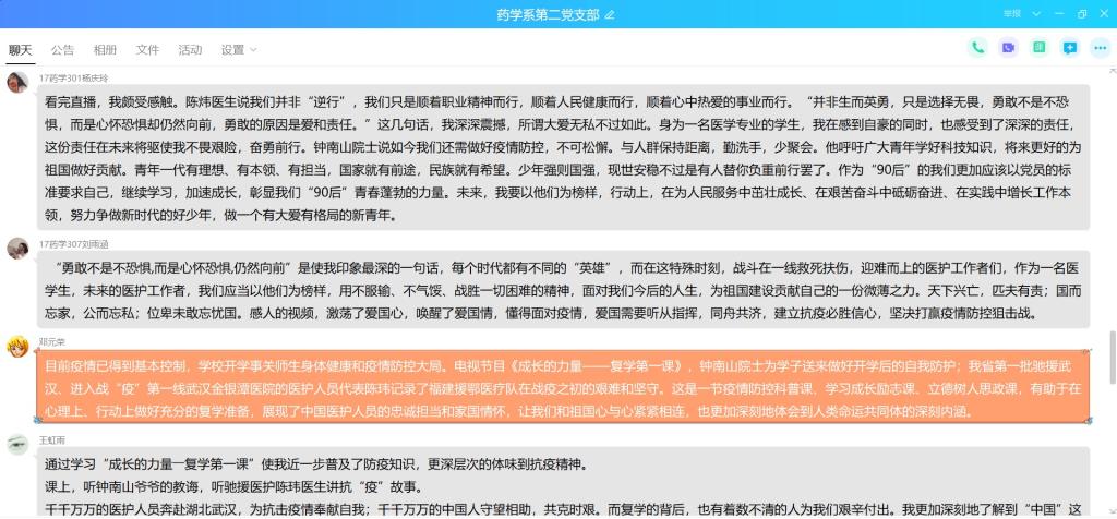 節(jié)目結(jié)束后,支部成員于線上集合紛紛發(fā)表觀后感。這是一節(jié)疫情防控科普課、學(xué)習(xí)成長勵志課、立德樹人思政課,展現(xiàn)了中國醫(yī)護人員的忠誠擔當和家國情懷,讓我們和祖國心與心緊緊相連,也更加深刻地體會到人類命運共同體的深刻內(nèi)涵。同時,作為醫(yī)學(xué)院校的老師,我們應(yīng)當積極向鐘南山、李蘭娟院士們學(xué)習(xí),培育好學(xué)生,為中國的醫(yī)療衛(wèi)生事業(yè)貢獻一份力量!