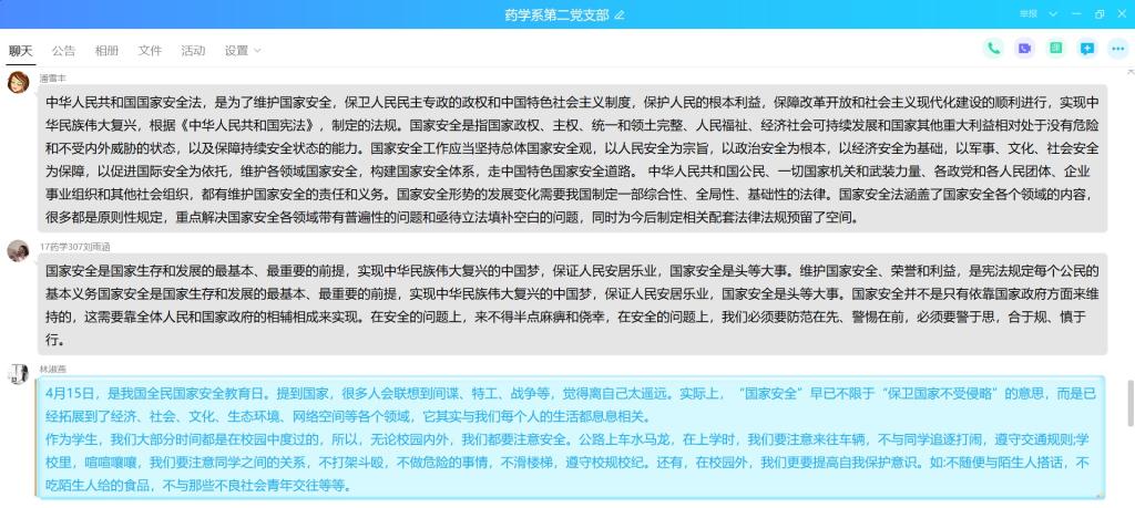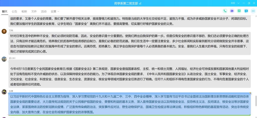 2020年4月14日,為了進一步貫徹落實習近平總書記提出的“總體國家安全觀”,增強全體黨員的國家安全意識,藥學系第二黨支部在微信群開展國家安全教育日線上專題學習。