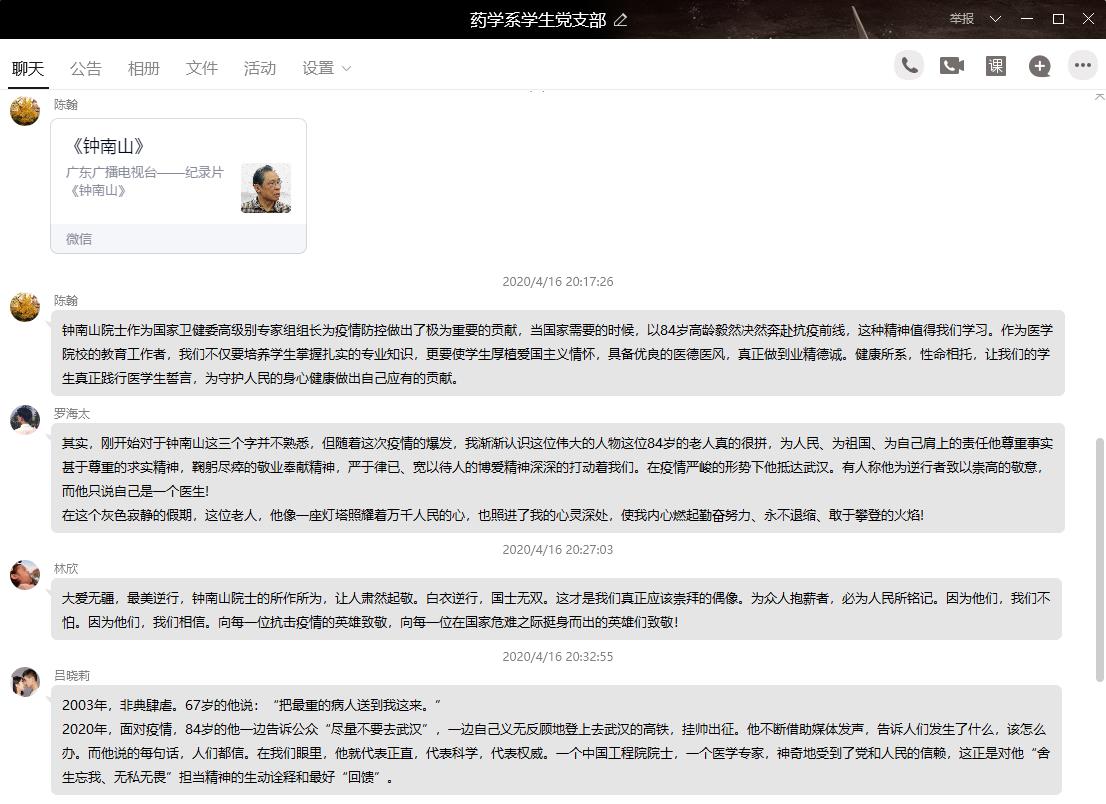 “我想來想去,只不過還是個醫(yī)生”,在疫情防控進入關鍵時刻,4月16日,藥學系學生黨支部通過QQ平臺開展主題黨日活動,集中觀看學習紀錄片《鐘南山》,支部全體師生黨員參與學習。