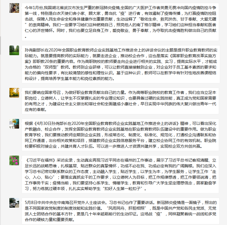 會(huì)上,中心組成員集中學(xué)習(xí)了《4月30日孫堯部長(zhǎng)在2020年全國(guó)職業(yè)教育教師企業(yè)實(shí)踐基地工作推進(jìn)會(huì)上的講話》、《習(xí)近平在福州(五)》、《習(xí)近平在福州(六)》、《習(xí)近平總書記在黨外人士座談會(huì)上的講話》等內(nèi)容。學(xué)習(xí)過程中,各成員立足崗位實(shí)際,發(fā)表心得體會(huì)。何舒瀾同志指出孫堯副部長(zhǎng)在 2020 年全國(guó)職業(yè)教育教師企業(yè)實(shí)踐基地工作推進(jìn)會(huì)上的講話突出了一個(gè)實(shí)字,為“雙師型”教師隊(duì)伍的培養(yǎng)指出了明確的方向,高職教師中的“雙師”并不能只是具有雙證的教師,而應(yīng)該是真正有技術(shù)的,能勝任企業(yè)工作崗位的真正“雙師”。鄧元榮同志表示通過學(xué)習(xí)《習(xí)近平在福州》采訪實(shí)錄,我們深切地體會(huì)到了習(xí)近平總書記視群眾為親人的為民情懷和“馬上就辦、真抓實(shí)干”等優(yōu)良作風(fēng),對(duì)共產(chǎn)黨人的初心和使命有了更真切、更深刻的感悟,也深切地感受到習(xí)近平總書記對(duì)福州建設(shè)的高度重視,他的大局觀和系統(tǒng)思維對(duì)開發(fā)區(qū)高質(zhì)量發(fā)展具有戰(zhàn)略性、前瞻性指導(dǎo)意義。