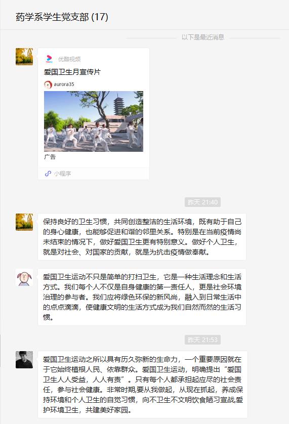 愛國是核心、衛(wèi)生是根本、運動是方式。支部陳翰書記在集體觀看后帶頭發(fā)表感想,他指出,保持良好衛(wèi)生習慣,共同創(chuàng)造整潔的生活環(huán)境,既有助于自己的身心健康,也能夠促進和諧的鄰里關(guān)系。特別是在當前疫情尚未結(jié)束的情況下,做好愛國衛(wèi)生更有特別意義,做好個人衛(wèi)生,就是對社會、對國家的貢獻,就是為抗擊疫情做奉獻。