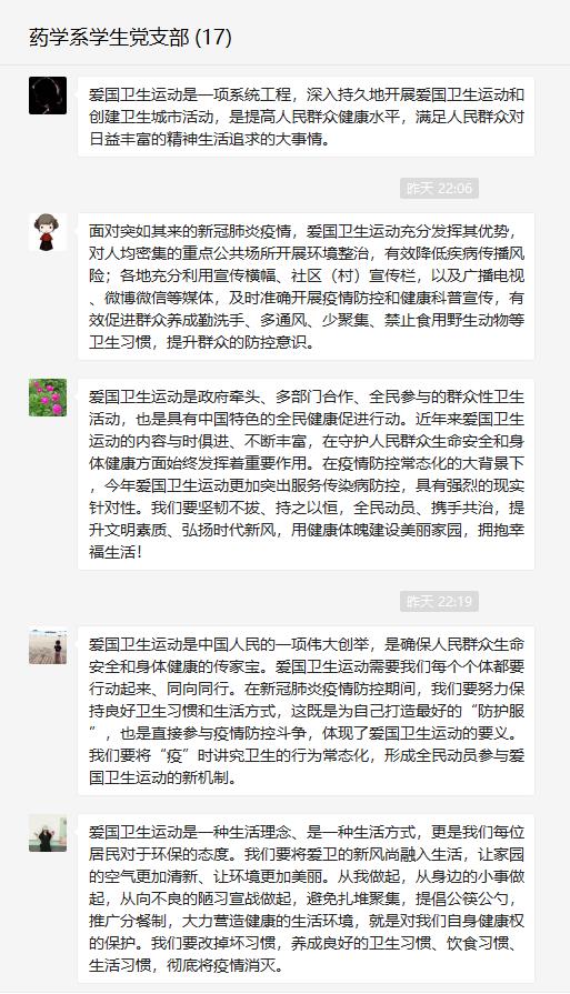 愛國衛(wèi)生人人受益,疫情防控人人有責。6月16日,藥學系學生黨支部通過微信平臺,觀看“愛國衛(wèi)生月宣傳片”,集中學習愛國衛(wèi)生運動精神。