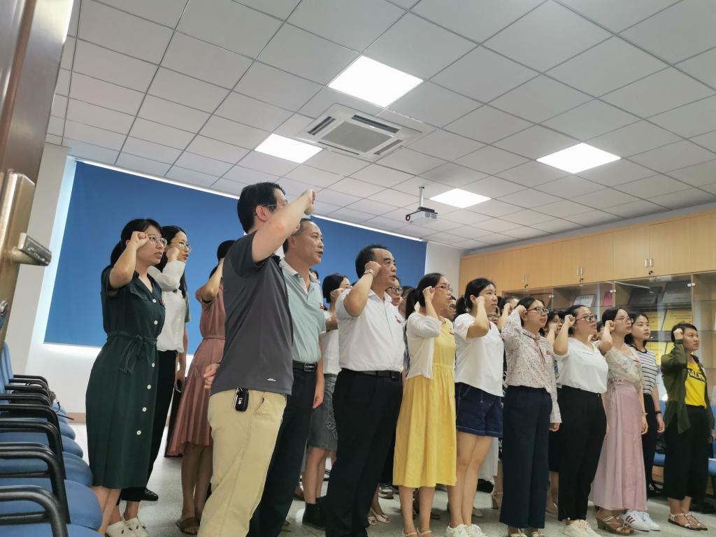 面對鮮紅的黨旗,全體黨員高舉右拳,在總支組織委員何舒瀾同志的帶領(lǐng)下,莊嚴(yán)宣誓。鏗鏘有力的誓詞,響徹會場,強(qiáng)烈震撼著每一位黨員的內(nèi)心。拳頭里握的是信念、是信仰,心中燃起的是對黨的熱愛與忠誠,肩上擔(dān)負(fù)的是責(zé)任與使命。