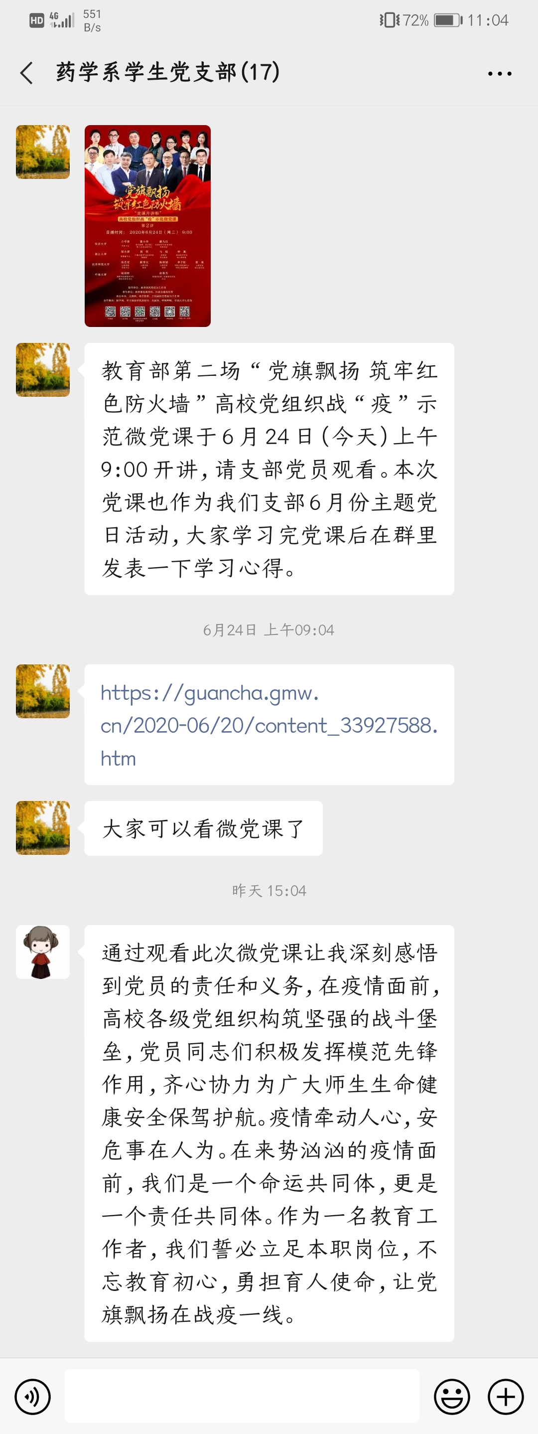 黨課后,藥學(xué)系黨總支黃嵩梅組織員及學(xué)生黨支部陳翰書記帶頭分享感悟,支部黨員紛紛表示,在疫情面前,高校各級(jí)黨組織構(gòu)筑堅(jiān)強(qiáng)的戰(zhàn)斗堡壘,黨員同志們積極發(fā)揮先鋒模范作用,齊心協(xié)力為廣大師生生命健康安全保駕護(hù)航;疫情牽動(dòng)人心,安危事在人為,在來(lái)勢(shì)洶洶的疫情面前,我們是一個(gè)命運(yùn)共同體,更是一個(gè)責(zé)任共同體;作為一名教育工作者,我們誓必立足本職崗位,不忘教育初心,勇?lián)耸姑?,讓黨旗飄揚(yáng)在戰(zhàn)疫一線。