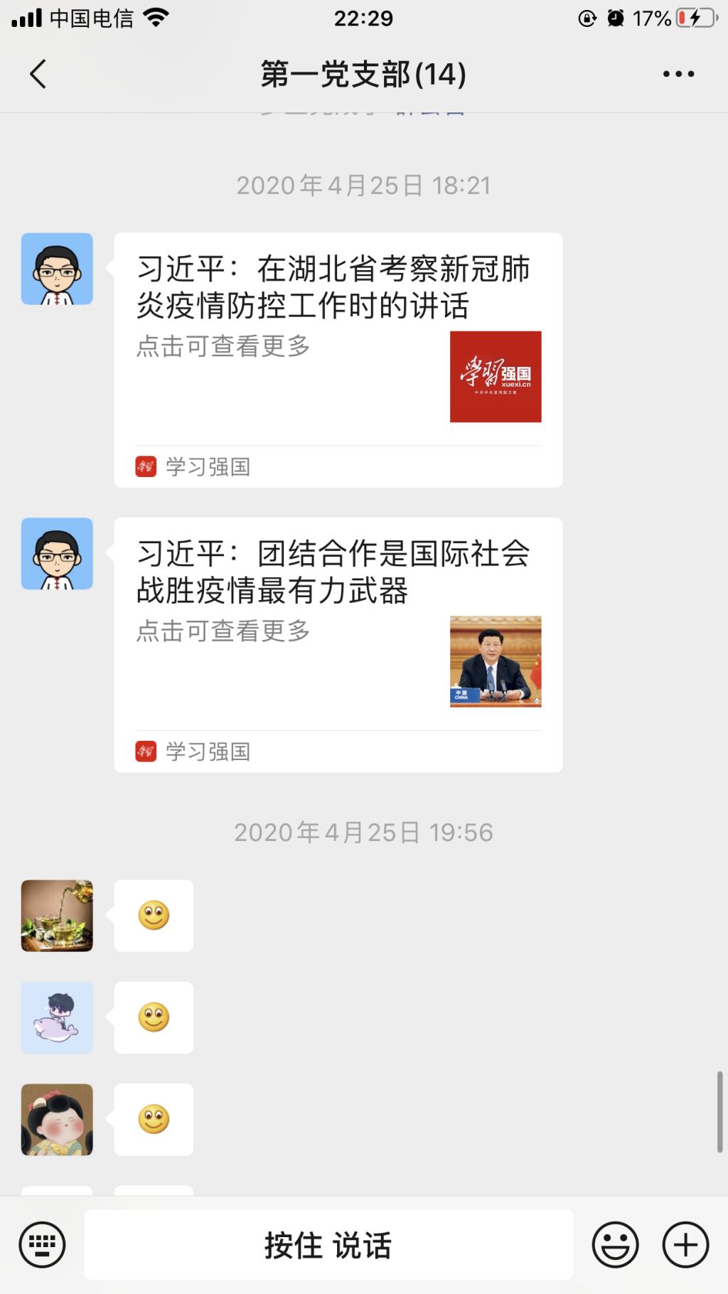 4月25日,藥學(xué)系第一黨支部通過微信平臺,集中學(xué)習(xí)“習(xí)近平在湖北省考察新冠肺炎疫情防控工作時的講話”、“習(xí)近平:團(tuán)結(jié)合作是國際社會戰(zhàn)勝疫情最有力武器”等內(nèi)容,活動由支部書記何舒瀾主持。