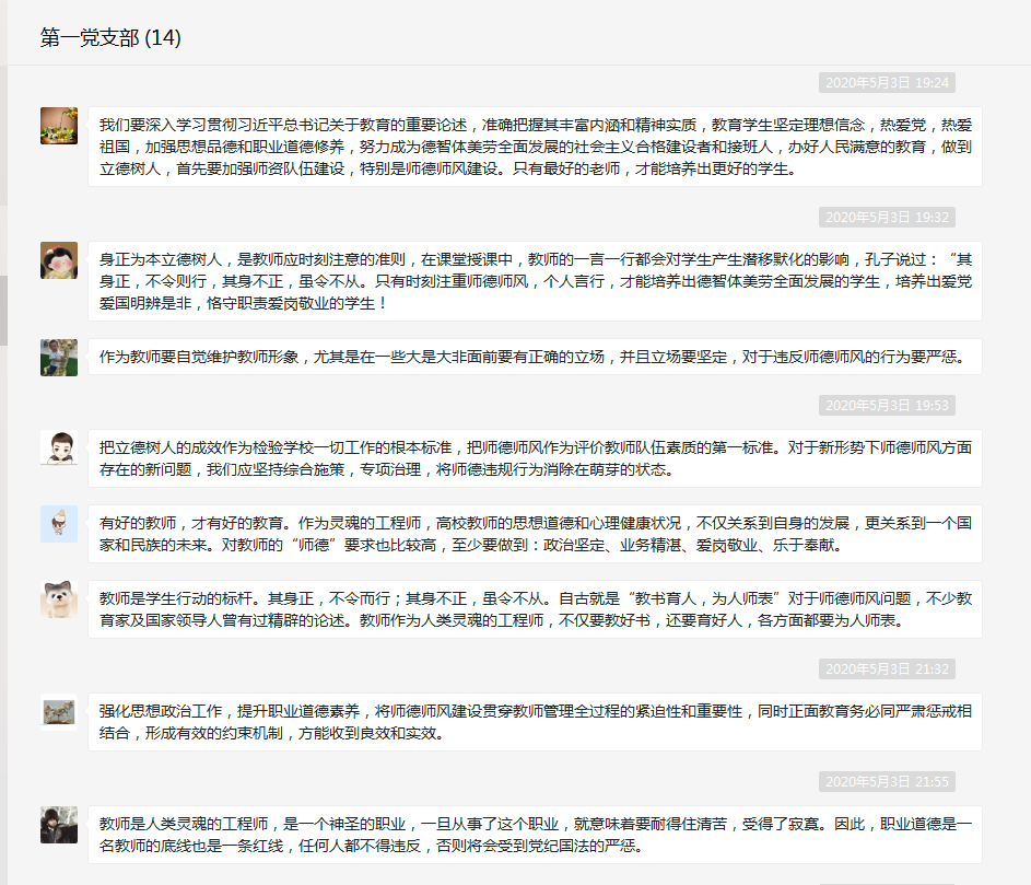 2020年5月3日,藥學(xué)系第一黨支部通過微信群在線開展師德師風(fēng)建設(shè)學(xué)習(xí)活動,本次支部活動恰逢五一小長假,黨員同志在休息的同時不忘學(xué)習(xí),認真研讀了《加強師德建設(shè)當(dāng)堅持失責(zé)必問》、《教育部強調(diào)師德師風(fēng)第一標(biāo)準(zhǔn):嚴(yán)重違規(guī)者將終身禁教》兩篇文章?;顒佑芍Р繒浐问鏋懼鞒?。