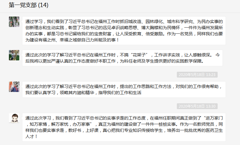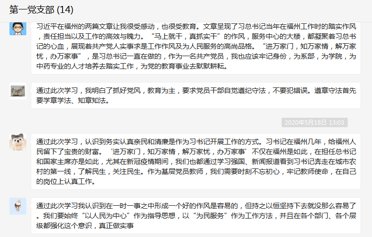 5月16日,藥學(xué)系第一黨支部在微信上在線學(xué)習(xí)《習(xí)近平在福州(五)習(xí)近平為福州人民留下寶貴財(cái)富》和《習(xí)近平在福州(六)習(xí)近平同志提出要“進(jìn)萬家門,知萬家情,解萬家憂,辦萬家事”》兩篇采訪實(shí)錄,會(huì)議由支部書記何舒瀾主持。