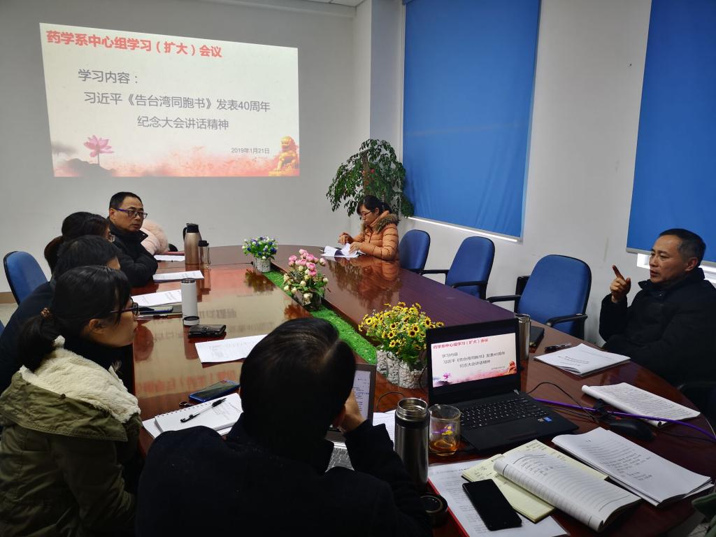 1月21日,藥學(xué)系組織中心組學(xué)習(xí)(擴大)會,主要學(xué)習(xí)習(xí)近平總書記在《告臺灣同胞書》發(fā)表40周年紀(jì)念大會講話精神。學(xué)習(xí)會由總支副書記陳潔主持,班子成員、總支委員、支部書記及團總支書記參加了此次學(xué)習(xí)。