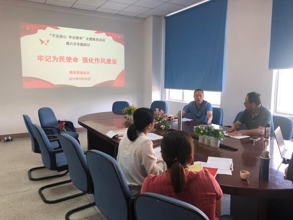 9月26日上午,藥學系黨總支在系部會議室開展主題為“牢記為民使命,強化作風建設”專題學習研討交流會。藥學系黨總支書記鄭力宏主持會議,藥學系副主任肖?。ㄖ鞒止ぷ鳎Ⅻh總支副書記賴文金、系副主任潘雪豐參加了本次研討交流會。