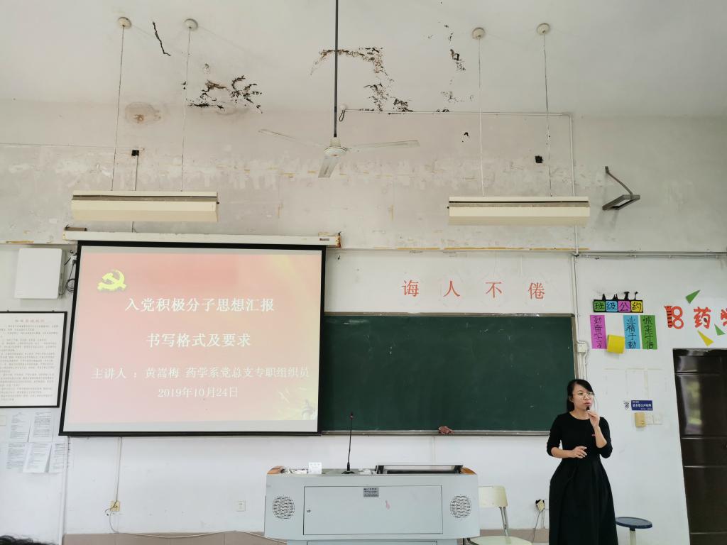 為進(jìn)一步規(guī)范學(xué)員們書寫思想?yún)R報(bào)的內(nèi)容及格式,2019年10月24日,藥學(xué)系于藥二階開展第二十二期業(yè)余分黨校專題培訓(xùn),本次培訓(xùn)主題是“入黨積極分子思想?yún)R報(bào)書寫格式及要求”,由藥學(xué)系黨總支專職組織員黃嵩梅老師主講。