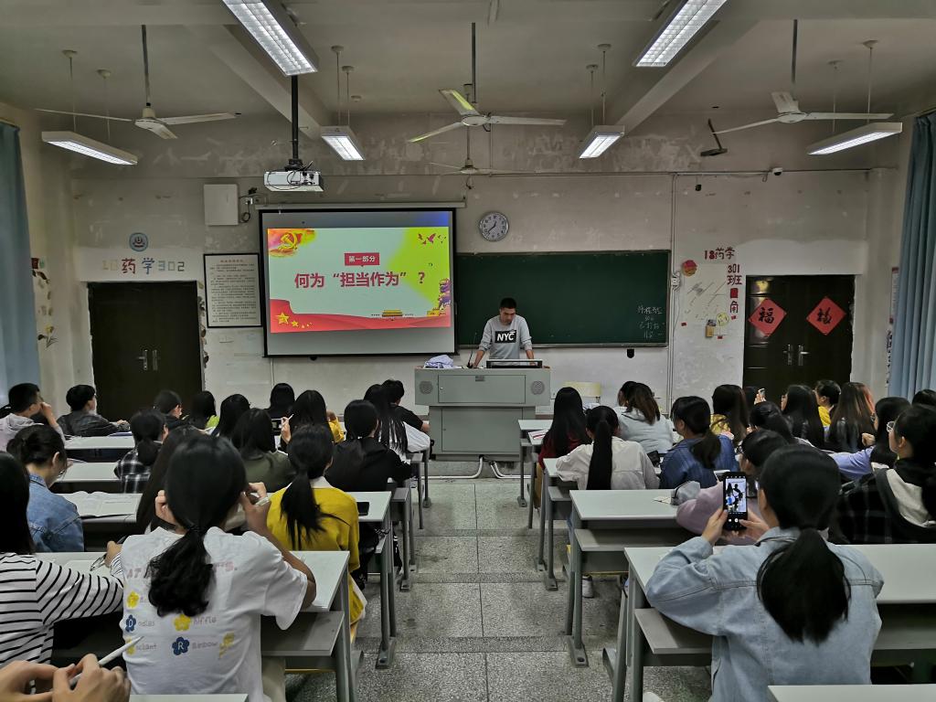 為進(jìn)一步深入學(xué)習(xí)黨的光輝歷史,增強(qiáng)學(xué)員們敢于擔(dān)當(dāng)主動(dòng)作為的意識(shí),2019年11月11日,藥學(xué)系黨總支于藥一階開展業(yè)余分黨校第八講,本次學(xué)習(xí)的主題是“敢擔(dān)當(dāng)有作為、筑夢新時(shí)代”,由藥學(xué)系學(xué)生黨支部吳建民老師主講。