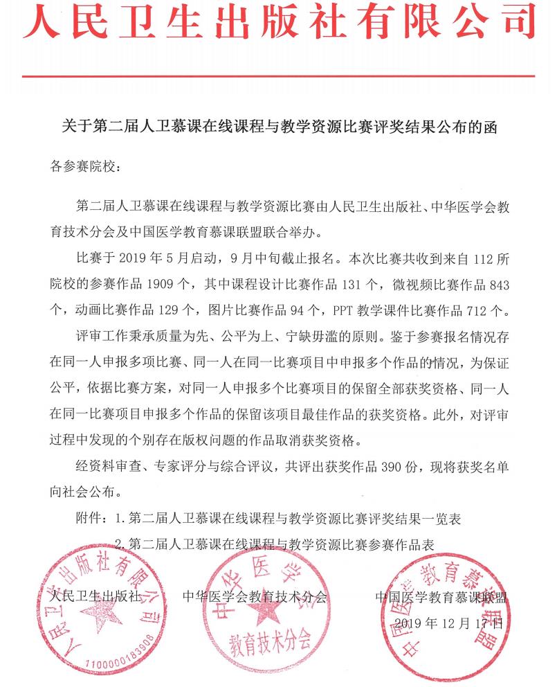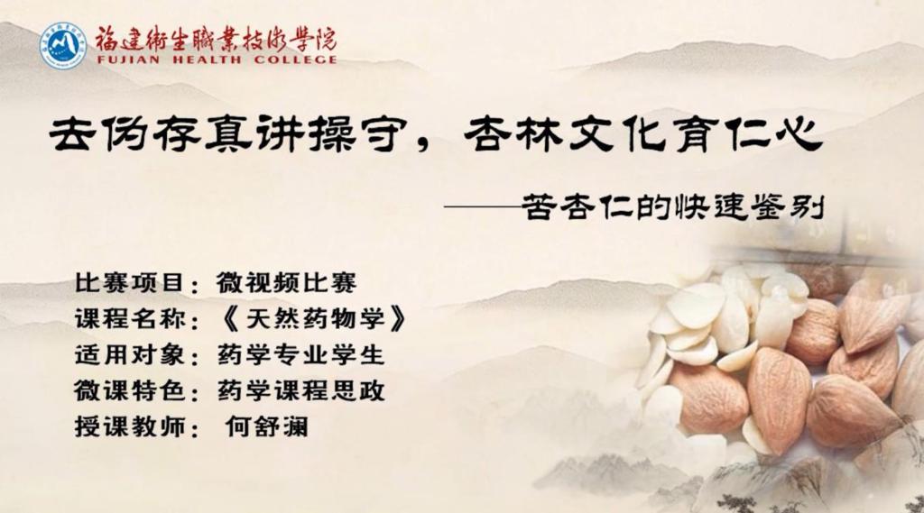 第二屆人衛(wèi)慕課在線課程與教學(xué)資源比賽由人民衛(wèi)生出版社、中華醫(yī)學(xué)會教育技術(shù)分會及中國醫(yī)學(xué)教育慕課聯(lián)盟聯(lián)合舉辦。本次比賽于2019年5月啟動,9月中旬截止報名,共收到微視頻作品843個。12月17日人衛(wèi)慕課官網(wǎng)公布評獎結(jié)果,中高職組共有36個微視頻獲獎,藥學(xué)系何舒瀾、林玲、陳鈺三位老師的作品《去偽存真講操守,杏林文化育仁心——苦杏仁的快速鑒別》在眾多作品中脫穎而出,榮獲二等獎。