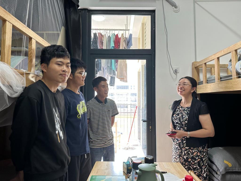 黃銘珊副校長(zhǎng)詳細(xì)詢問了新生學(xué)習(xí)與生活的適應(yīng)情況,傾聽學(xué)生的意見與建議。耐心了解每位同學(xué)的家鄉(xiāng)與生活習(xí)慣,“你是哪里人?飲食還習(xí)慣嗎?班上課程跟的上嗎?……”一句句問候深暖人心。她勉勵(lì)同學(xué)們做好學(xué)習(xí)規(guī)劃,認(rèn)真學(xué)習(xí)專業(yè)知識(shí),爭(zhēng)取學(xué)有所成。