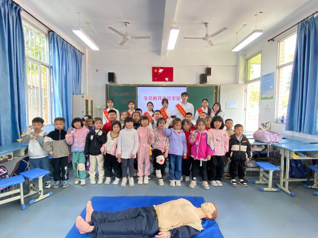 活動開始,黨員們乘車前往連江縣潘渡鎮(zhèn)中心小學(xué)。學(xué)生預(yù)備黨員發(fā)揚(yáng)閩衛(wèi)醫(yī)學(xué)生特長,組織開展生命教育體驗(yàn)學(xué)堂活動,生動形象地給小朋友們講解了心肺復(fù)蘇、緊急救護(hù)的正確步驟及如何運(yùn)用三角巾及繃帶包扎傷口,并“手把手”指導(dǎo)同學(xué)們實(shí)操演練,讓小朋友們更直觀地領(lǐng)會、掌握急救知識技能及要領(lǐng)。