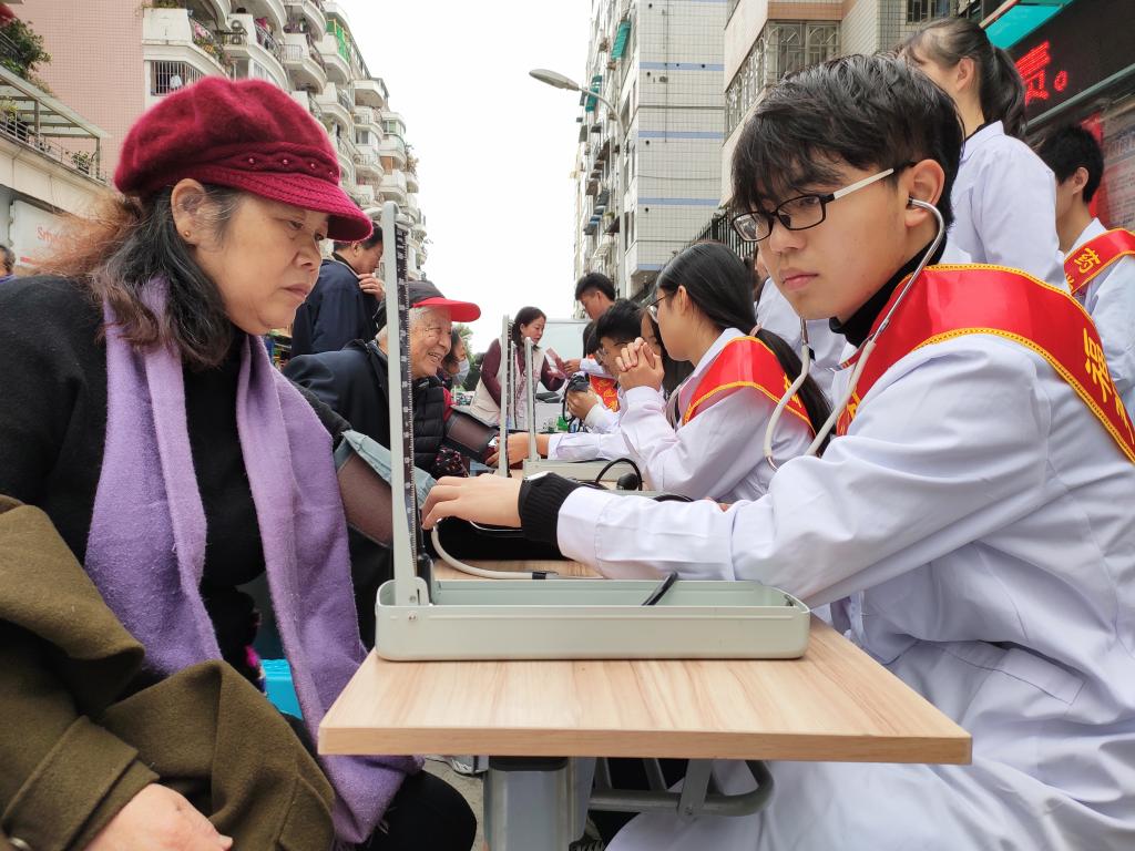 當(dāng)天上午,志愿者們?cè)缭绲氐竭_(dá)社區(qū)進(jìn)行準(zhǔn)備工作,各司其職,各盡其責(zé)?;顒?dòng)開(kāi)始不久,排隊(duì)群眾就絡(luò)繹不絕。同學(xué)們認(rèn)真、熱情地為每一位居民們提供量血壓、測(cè)血糖、推拿拔罐、健康知識(shí)宣講等義診服務(wù),并對(duì)居民咨詢的問(wèn)題一一給予解答。同時(shí),還提醒前來(lái)就診的老年人要定期進(jìn)行體檢,鼓勵(lì)他們要樹(shù)立積極樂(lè)觀的生活態(tài)度,對(duì)部分存在亞健康的年輕人建議要規(guī)律作息時(shí)間,合理搭配飲食,養(yǎng)成健康的生活習(xí)慣。