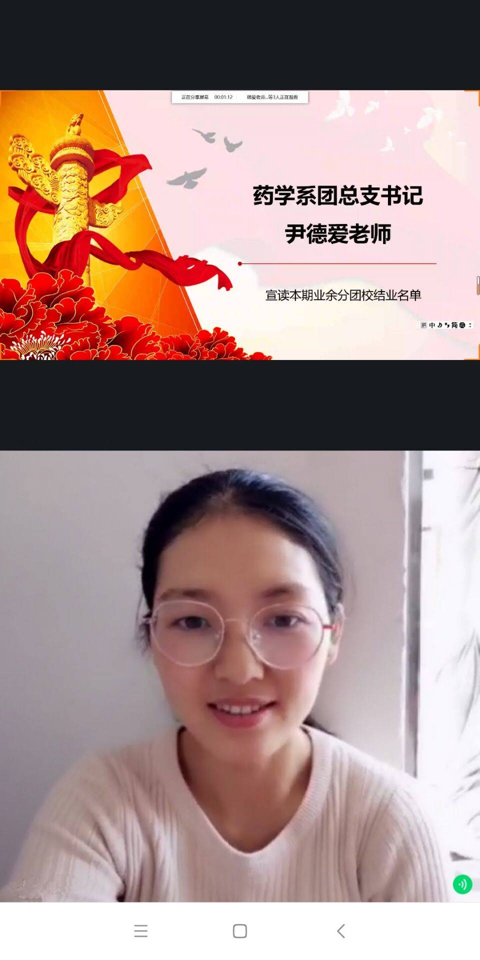2020年3月26日,藥學(xué)系第十五期、管理系第四期業(yè)余分團(tuán)校結(jié)業(yè)典禮在線上召開(kāi),藥學(xué)系團(tuán)總支書(shū)記尹德愛(ài)老師、管理系團(tuán)總支書(shū)記趙茜老師參加了結(jié)業(yè)典禮。
