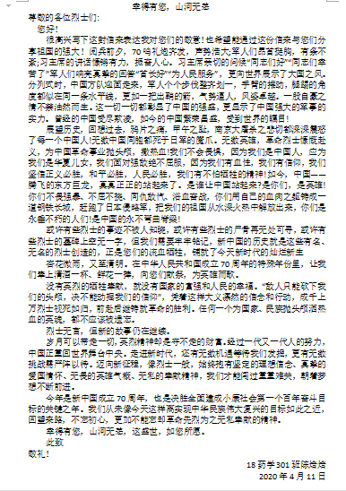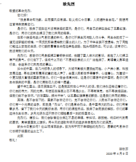 一封書(shū)信,銘記感動(dòng),傳承信仰。本次活動(dòng)的開(kāi)展,使同學(xué)們深切感受到:幸福生活來(lái)之不易,當(dāng)下的歲月靜好,不過(guò)是總有英雄替我們負(fù)重前行!對(duì)英烈們最好的紀(jì)念就是傳承,青少年要秉承英烈遺志,珍惜幸福生活,發(fā)奮圖強(qiáng),爭(zhēng)做新時(shí)代的追夢(mèng)人!