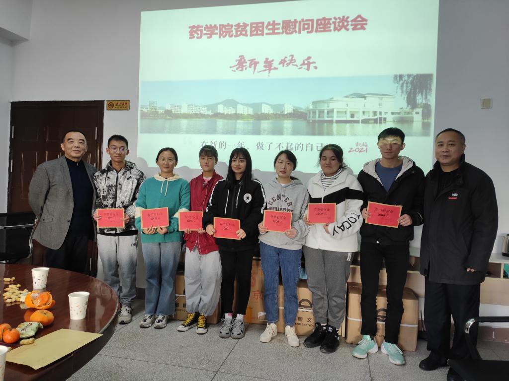 2021年1月1日,藥學(xué)院在207會議室召開省外貧困學(xué)生春節(jié)慰問座談會,學(xué)校紀(jì)委游鋒書記、藥學(xué)院黨總支鄭力宏書記、賴文金副書記以及省外貧困生代表共迎新年、共話未來。