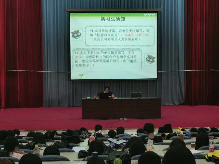 會(huì)上,潘雪豐副主任首先對(duì)即將步入實(shí)習(xí)的同學(xué)們表示了慰問(wèn)和祝福,并從專業(yè)角度詳細(xì)講解了醫(yī)院藥房、藥品生產(chǎn)企業(yè)和醫(yī)藥經(jīng)營(yíng)企業(yè)的實(shí)習(xí)內(nèi)容及要求,加深同學(xué)們對(duì)實(shí)習(xí)的了解,明確實(shí)習(xí)的目標(biāo)和方向。同時(shí),潘老師鼓勵(lì)同學(xué)們要積極擺正實(shí)習(xí)心態(tài),迅速完成角色轉(zhuǎn)換,邊實(shí)習(xí)邊學(xué)習(xí),努力找準(zhǔn)自身位置,實(shí)習(xí)期間要嚴(yán)格遵守實(shí)習(xí)紀(jì)律,給實(shí)習(xí)單位留下良好印象,為學(xué)院和系爭(zhēng)得榮譽(yù)。之后,陳潔副書(shū)記詳細(xì)地向同學(xué)們說(shuō)明了實(shí)習(xí)時(shí)間、實(shí)習(xí)請(qǐng)假手續(xù)、離校手續(xù)等須知事項(xiàng),并勉勵(lì)同學(xué)們?cè)趯?shí)習(xí)中虛心請(qǐng)教,認(rèn)真聽(tīng)取帶教老師的意見(jiàn)和建議,要充分認(rèn)識(shí)實(shí)習(xí)的重要性,嚴(yán)格遵守實(shí)習(xí)單位規(guī)章制度,同時(shí)要注意實(shí)習(xí)期間人身安全。最后,實(shí)踐管理科梁艷老師對(duì)同學(xué)們的實(shí)習(xí)問(wèn)題進(jìn)行了細(xì)致解答,并祝同學(xué)們實(shí)習(xí)順利,前程似錦!