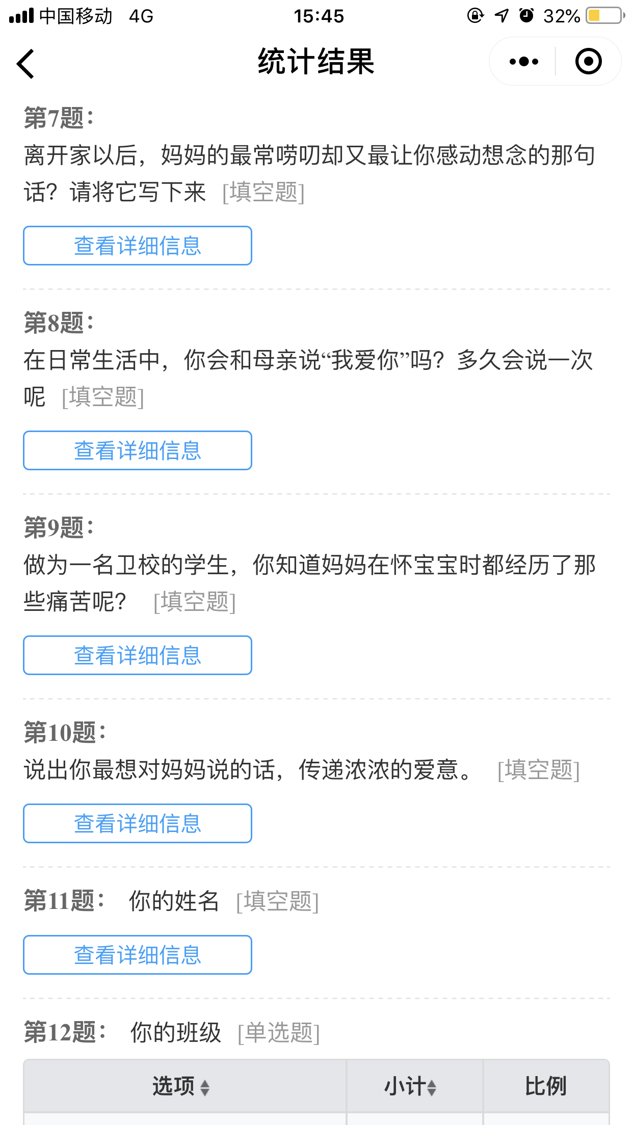 本次問卷共有12題,全部為填空題,共回收了580份問卷,有效回收率達(dá)98%。調(diào)查顯示:90%以上的學(xué)生知道母親節(jié)時間;90%的學(xué)生認(rèn)為母親節(jié)很重要;70%的學(xué)生記得母親的生日;60%的學(xué)生會在母親節(jié)送禮物; 50%每的學(xué)生會每周至少主動聯(lián)系母親一次;80%的學(xué)生能說出母親懷孕時所經(jīng)歷的痛苦;20%的學(xué)生曾對母親說過“我愛你”;80%的學(xué)生在調(diào)查最后中最想對母親說出“我愛你”。