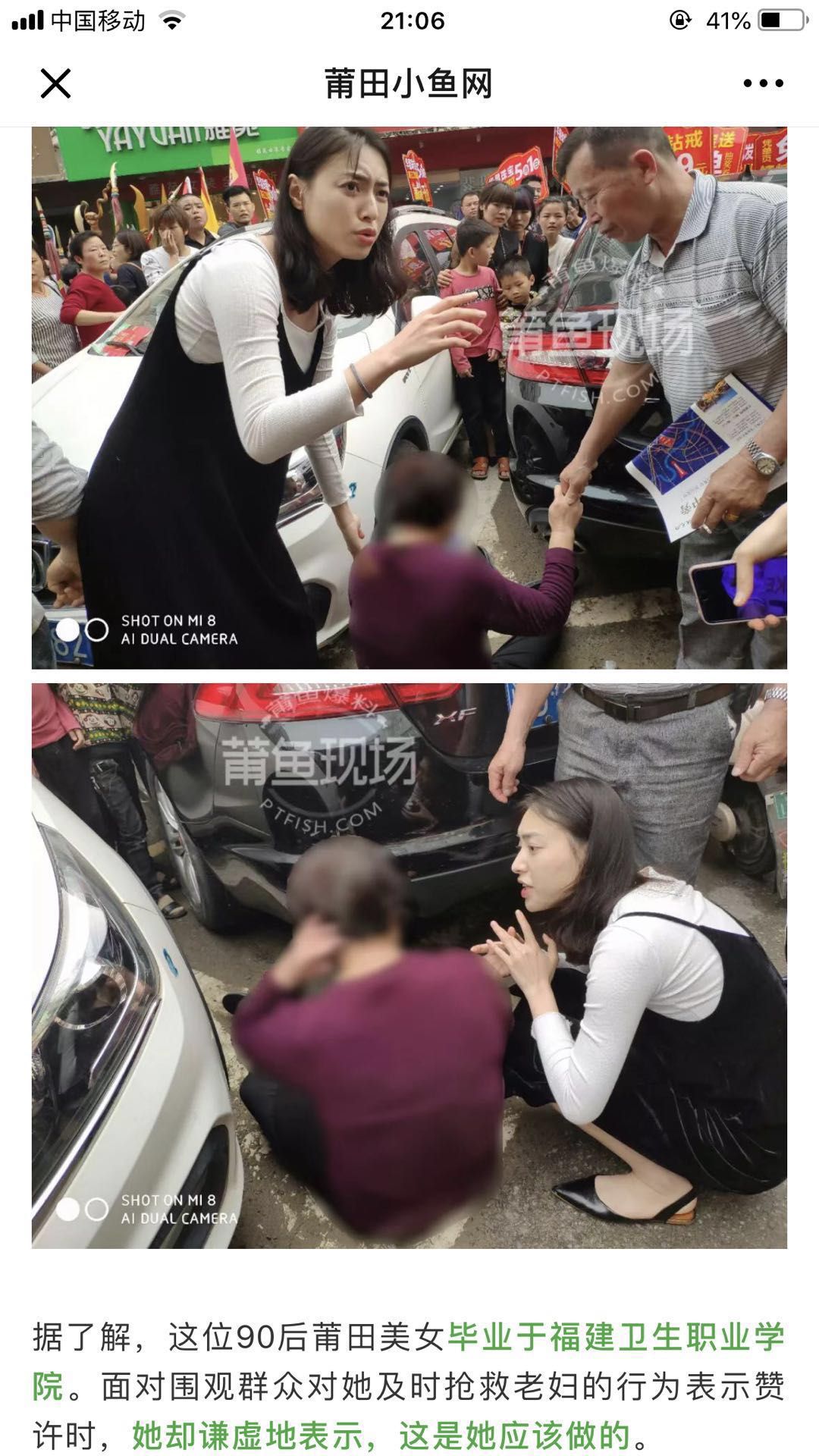 4月20日下午,莆田黃石東井街舉行盛大的民俗出游活動,吸引了大量市民圍觀,一位七旬老婦突發(fā)不適暈倒在地,正在眾人束手無策之際,我系2017屆畢業(yè)生蔡仕媚挺身而出,對老婦進行及時的搶救,并俯身為老婦喂水,直到老婦清醒方才離開。(莆田小魚網(wǎng)的一則《誰認(rèn)識這個莆田90后美女?全國網(wǎng)友都在找她…》的新聞刷爆了朋友圈)
