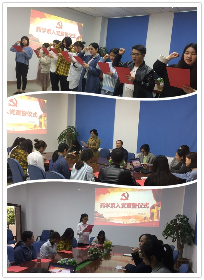 3月29日, 藥學系在系部會議室隆重舉行新黨員宣誓儀式??傊瘑T、支部書記、輔導員及8名學生新黨員參加了儀式。