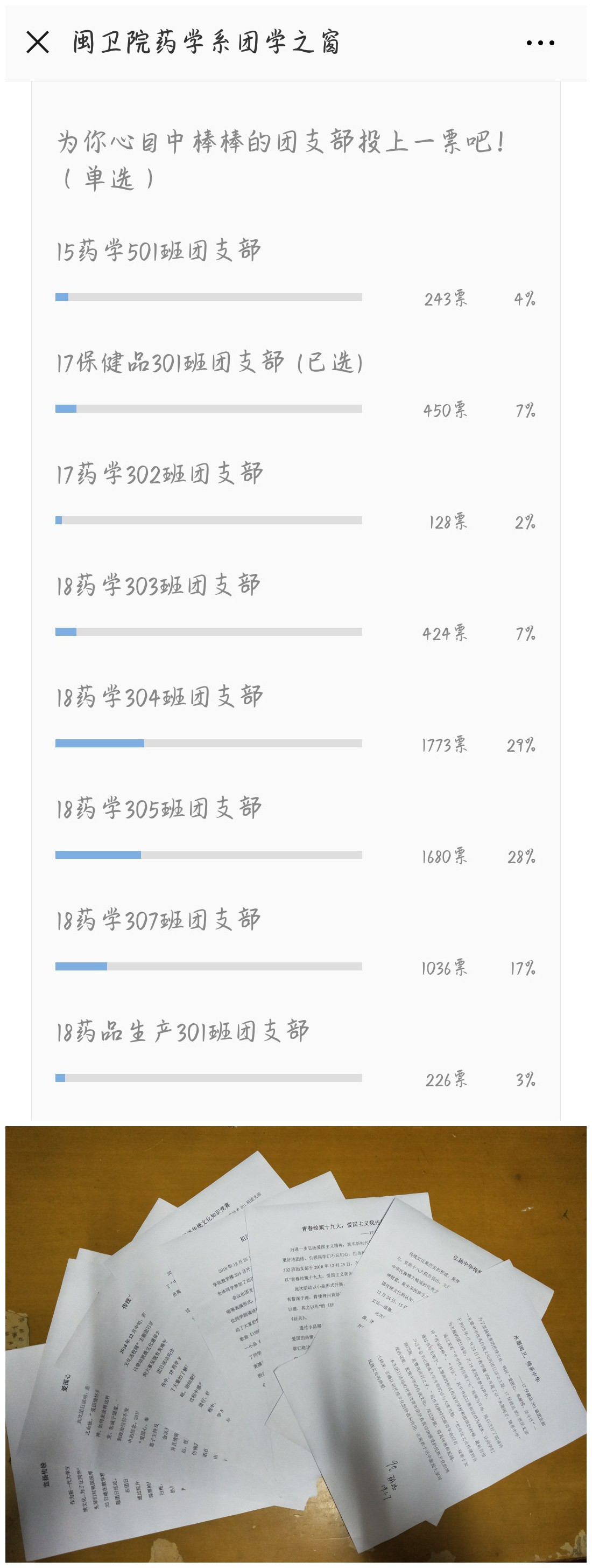 為了更好地宣傳此次團日活動,本次活動通過各班團支部提交的視頻、報道稿質(zhì)量共評選出了八個優(yōu)秀團支部。并在此基礎(chǔ)上,依托微信公眾號平臺,在平臺上發(fā)起投票,各團支部積極參與其中,為期兩天的網(wǎng)絡(luò)投票,票數(shù)達5960票,閱讀點擊量達7402次。最終,18藥學304團支部榮獲一等獎和最佳人氣團支部稱號;二等獎由18藥學307團支部和18藥學303團支部獲得;另有五個團支部分獲三等獎,它們分別是:17保健品301團支部、17藥學302團支部、18藥品生產(chǎn)301團支部、18藥學305團支部和15藥學501團支部。