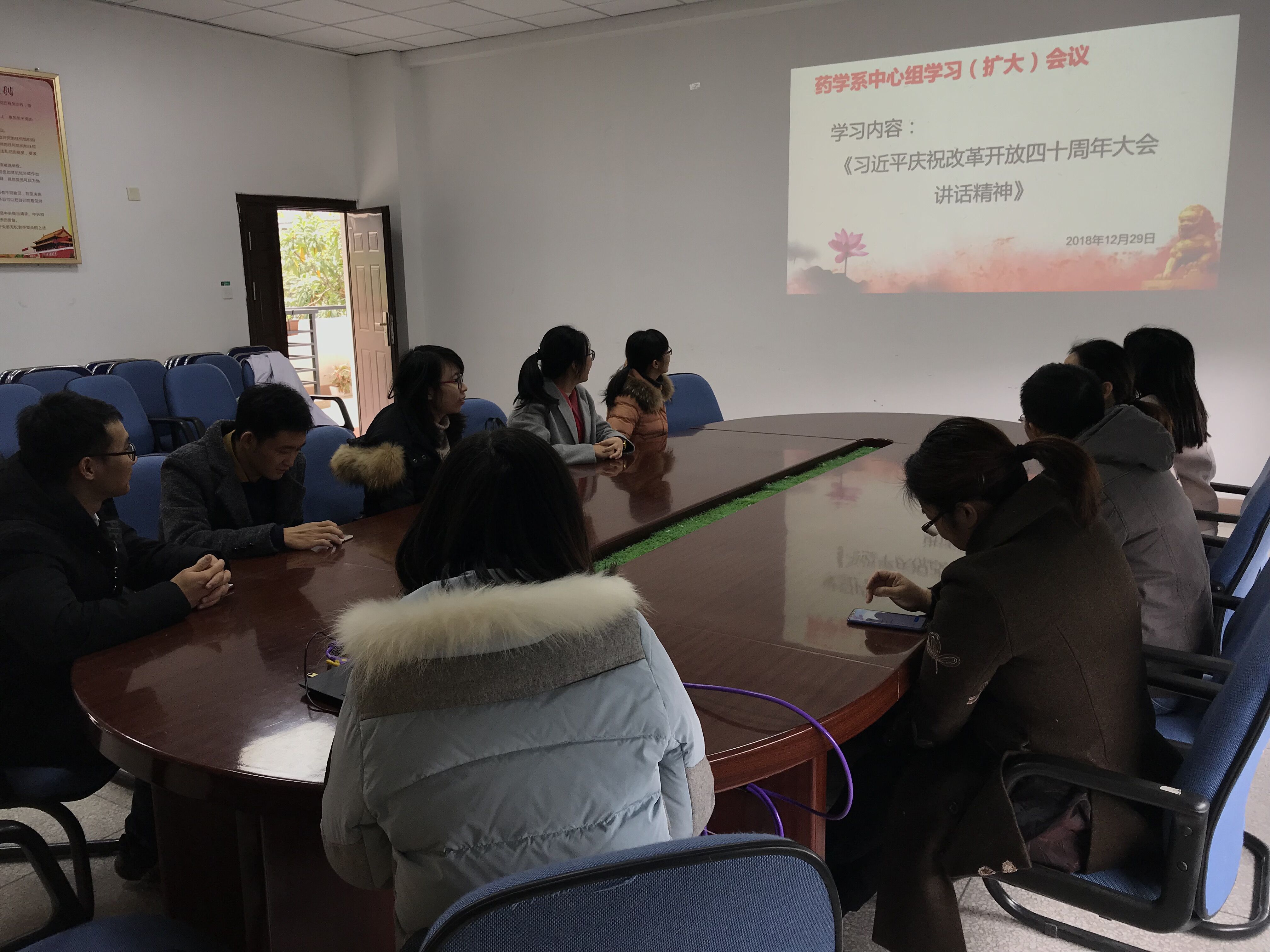 12月29日,藥學(xué)系黨總支組織召開(kāi)中心組學(xué)習(xí)(擴(kuò)大)會(huì),專題學(xué)習(xí)習(xí)近平總書(shū)記在慶祝改革開(kāi)放四十周年大會(huì)的重要講話精神??傊瘑T、各支部書(shū)記及輔導(dǎo)員們參加了本次學(xué)習(xí)。會(huì)議由黨總支副書(shū)記陳潔主持。