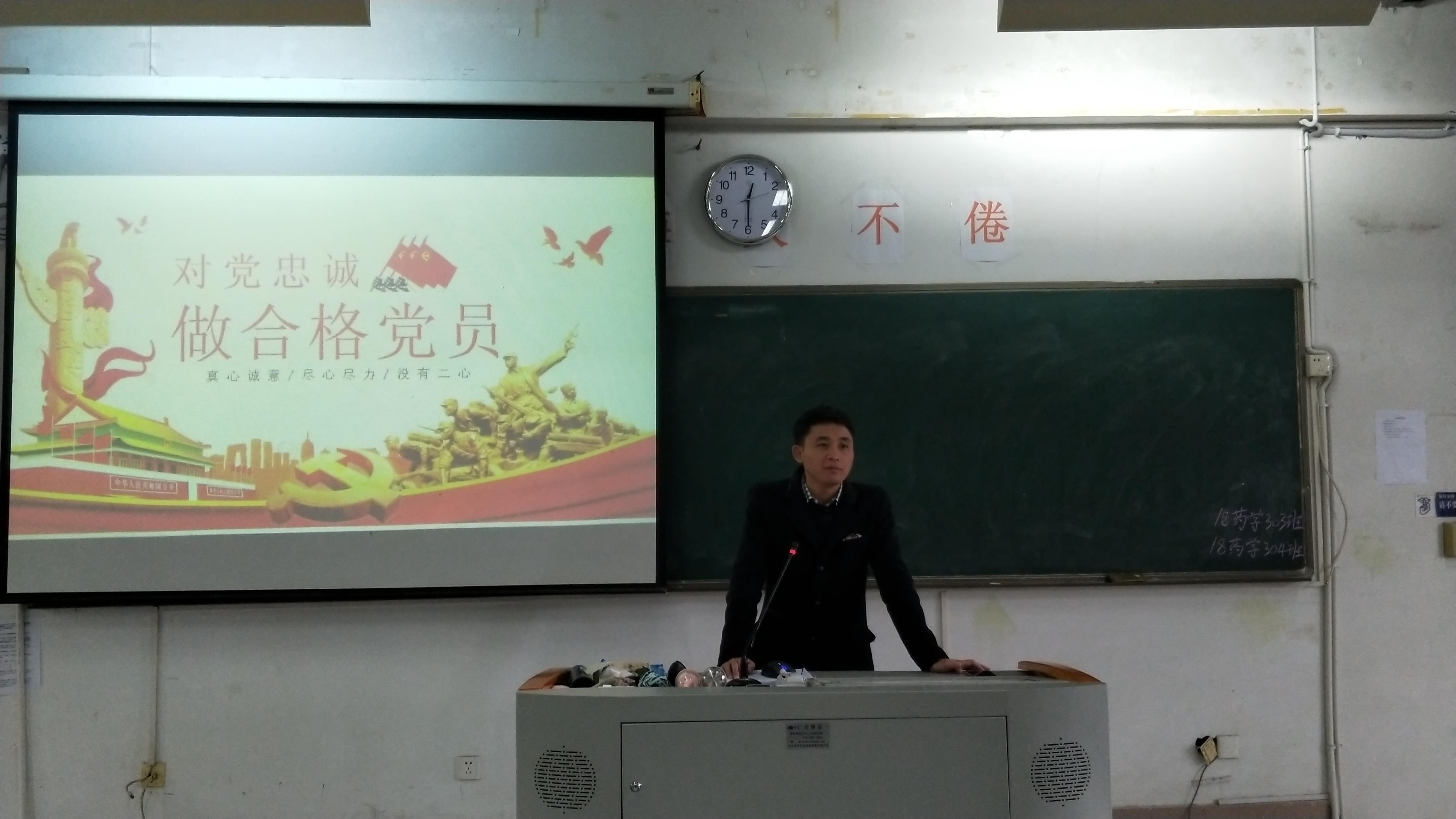 2018年11月30日,藥學(xué)系于藥二階開(kāi)展業(yè)余分黨校第九講,本次培訓(xùn)主題“對(duì)黨忠誠(chéng),做合格黨員”,由藥學(xué)系學(xué)生黨支部陳瀚老師主講。