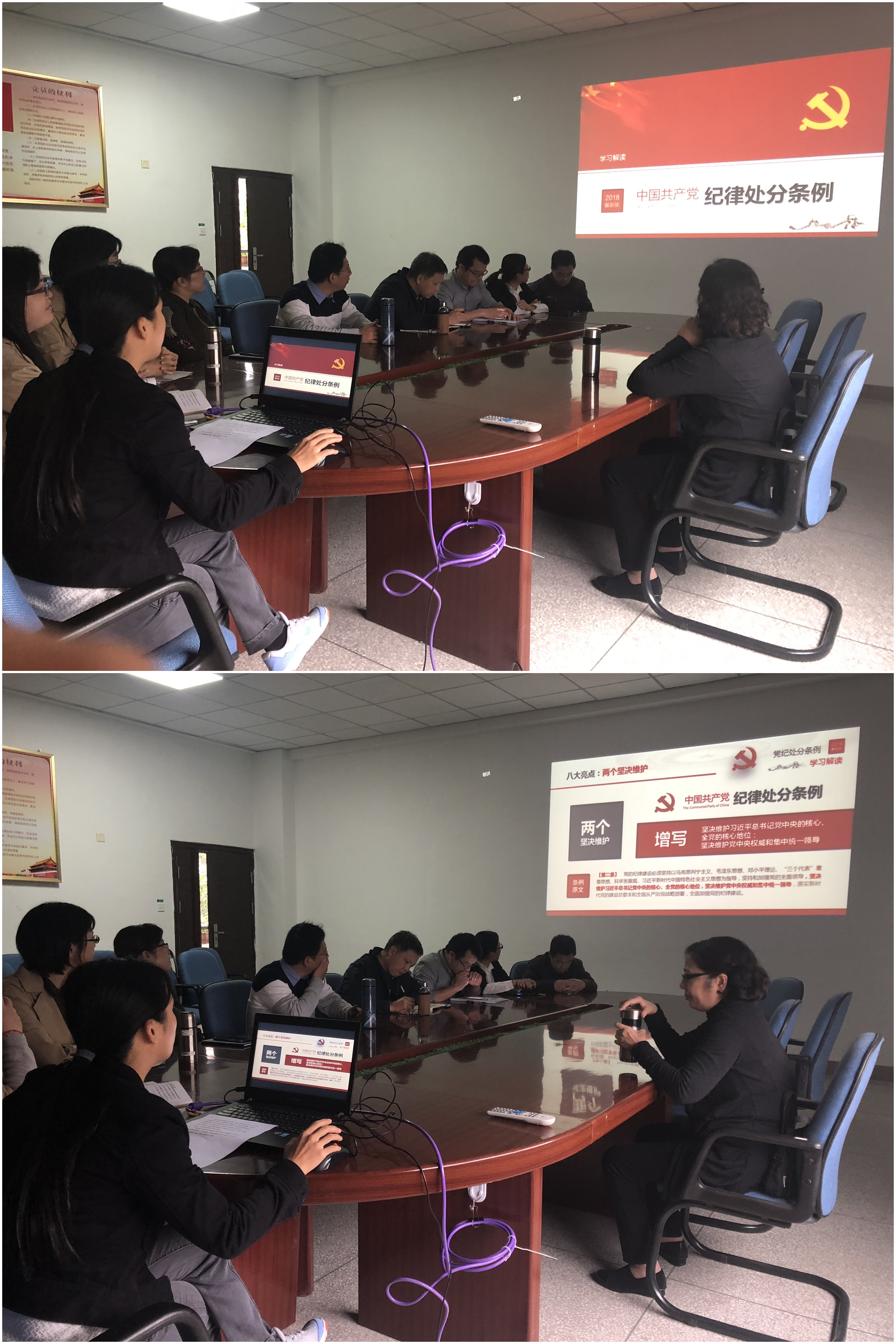 2018年11月1日下午,藥學系第一黨支部舉辦學習新修訂《中國共產黨紀律處分條例》的專題黨課。本次黨課由黨支部書記郭丹主講,藥學系第一黨支部全體黨員參加了本次學習。