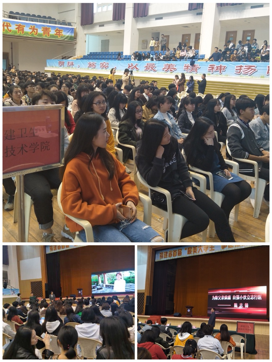 在本次報告會中,來自福建農(nóng)林大學(xué)的童璽分享大學(xué)生涯的創(chuàng)業(yè)、學(xué)業(yè)、人生的追夢歷程;福建醫(yī)科大的陳志峰分享用笑臉迎接悲慘的人生,播撒善意,傳遞溫暖;福建工程學(xué)院的施玲珊則分享敞開心扉接納他人服務(wù)他人的志愿之美,塑造宣傳踐行歷程的專業(yè)之美;寧德師范學(xué)院的葉思思給在場的師生講述了她永無止境的學(xué)習(xí),要贏就要贏到最后的比賽實踐經(jīng)驗。四位“最美學(xué)生”的精彩報告,事例生動、故事感人、令人振奮。他們的報告贏得了現(xiàn)場師生的陣陣掌聲。這場報告會給師生們帶來了極大的影響,使他們的精神受到了洗禮,思想得到了升華,靈魂得到了凈化。