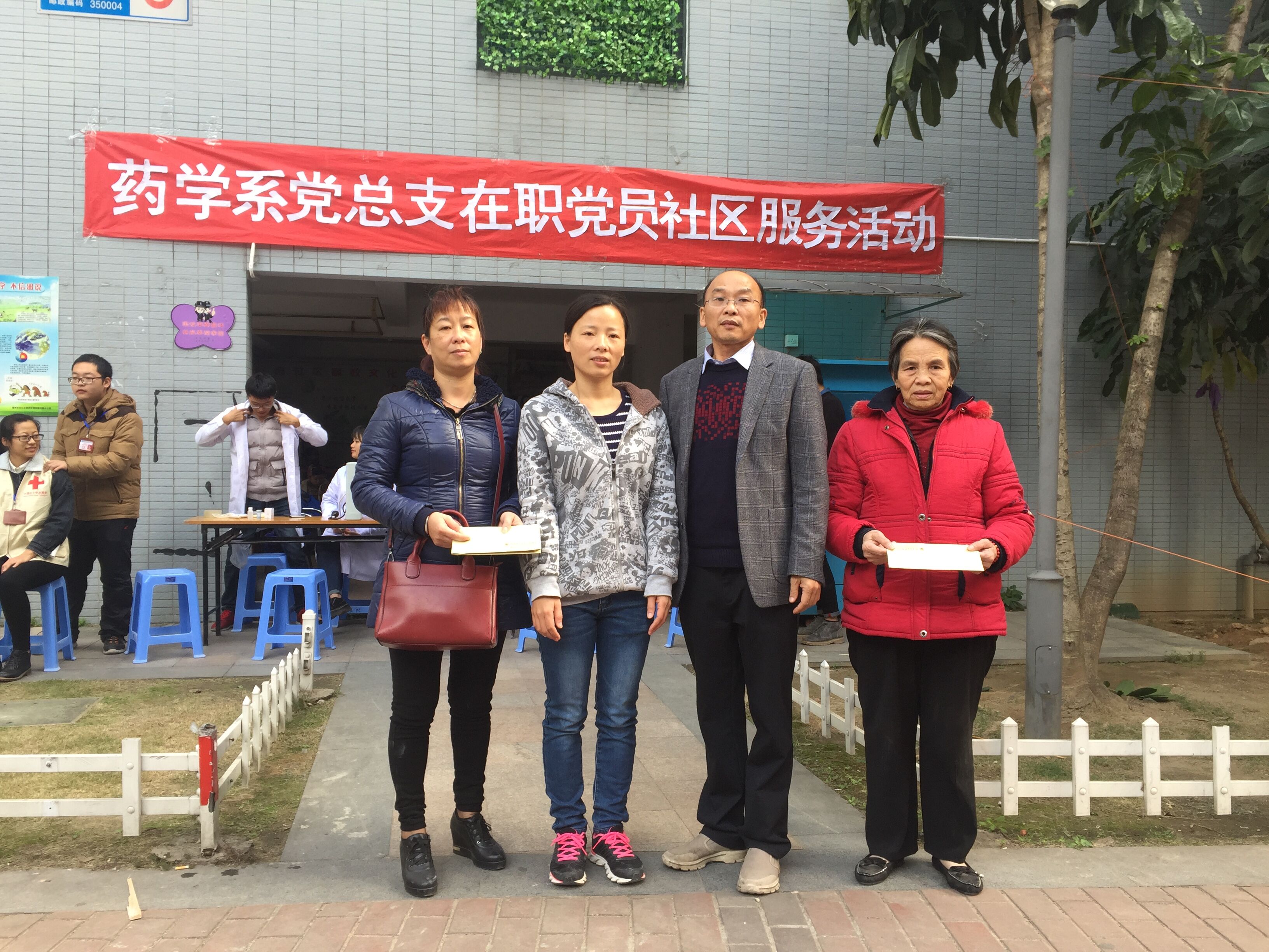 活動中,教師黨員們與學(xué)生一起為社區(qū)居民免費進(jìn)行了量血壓、測血糖、測視力等項目的健康檢測服務(wù),為居民免費發(fā)放常用藥品,宣傳安全用藥知識。同時,系部邀請了學(xué)院紅十字會成員為社區(qū)居民現(xiàn)場講解和示范關(guān)于心臟驟停后的急救措施、心肺復(fù)蘇的演習(xí)以及手腕受傷后的基本包扎等急救知識。另外,藥學(xué)系蘇愛華書記還深入社區(qū)家庭,看望空巢老人,為貧困家庭發(fā)放了困難慰問金。教師黨員和同學(xué)們精湛的專業(yè)知識、良好的服務(wù)態(tài)度及困難幫扶的愛心行為贏得了社區(qū)居民的一致好評,受到居民的贊賞。