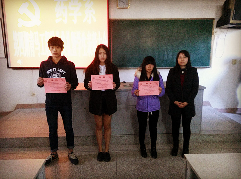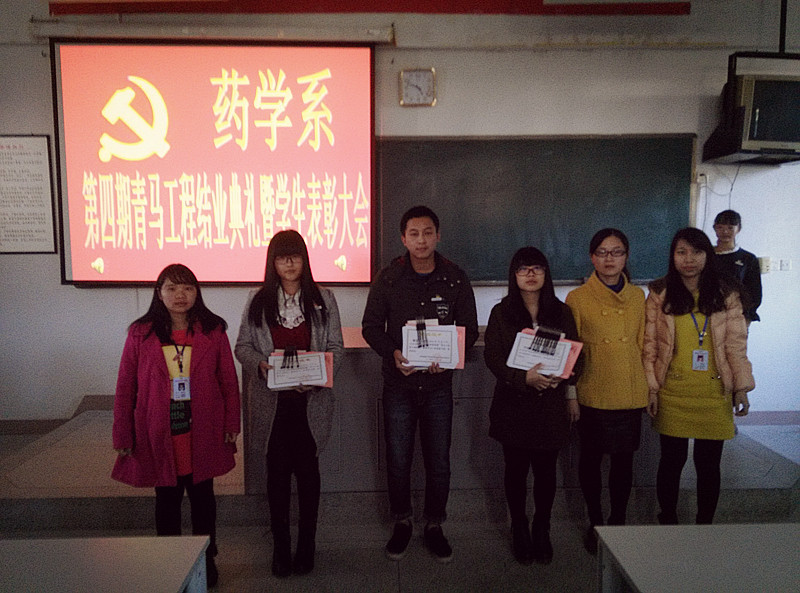 2014年12月30日下午,藥學系團總支于藥學系部二階舉辦藥學系第四期“青馬工程”結業(yè)典禮暨學生表彰大會。蒞臨本次大會的領導老師分別有,藥學系黨總支林穎峰副書記,藥學系團總支書記林麗鳳老師,系團總支副書記李寶珠老師,系輔導員胡丹老師,以及黃嵩梅老師。此次大會由郭杭英同學主持。